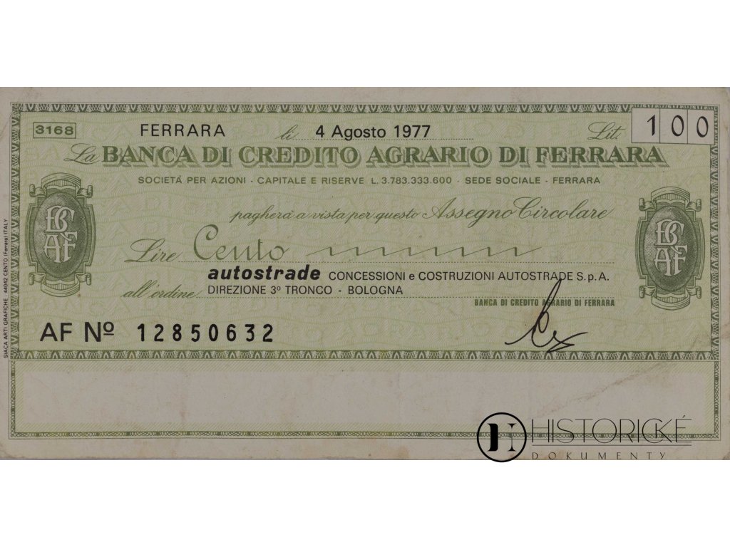 Šek vystaven na řad společnosti Autostrade Concessioni e Costruzioni Autostrade S.p.A., Direzione 3° Tronco Bologna, provozovatele italských dálnic. V sedmdesátých letech trpěla Itálie nedostatkem drobných mincí, což vedlo k rozšíření miniaturních šeků nahrazujících oběživo. Banky, obchody i podniky vydávaly tyto nouzové poukázky pro každodenní platby. Banca di Credito Agrario se sídlem ve Ferraře patřila k regionálním ústavům emitujícím Assegni. Tisk Siaca Arti Grafiche Cento. Rubová strana s podpisem a razítkem Autostrade. Zachovalost dobrá. Numismatická kuriozita italská.