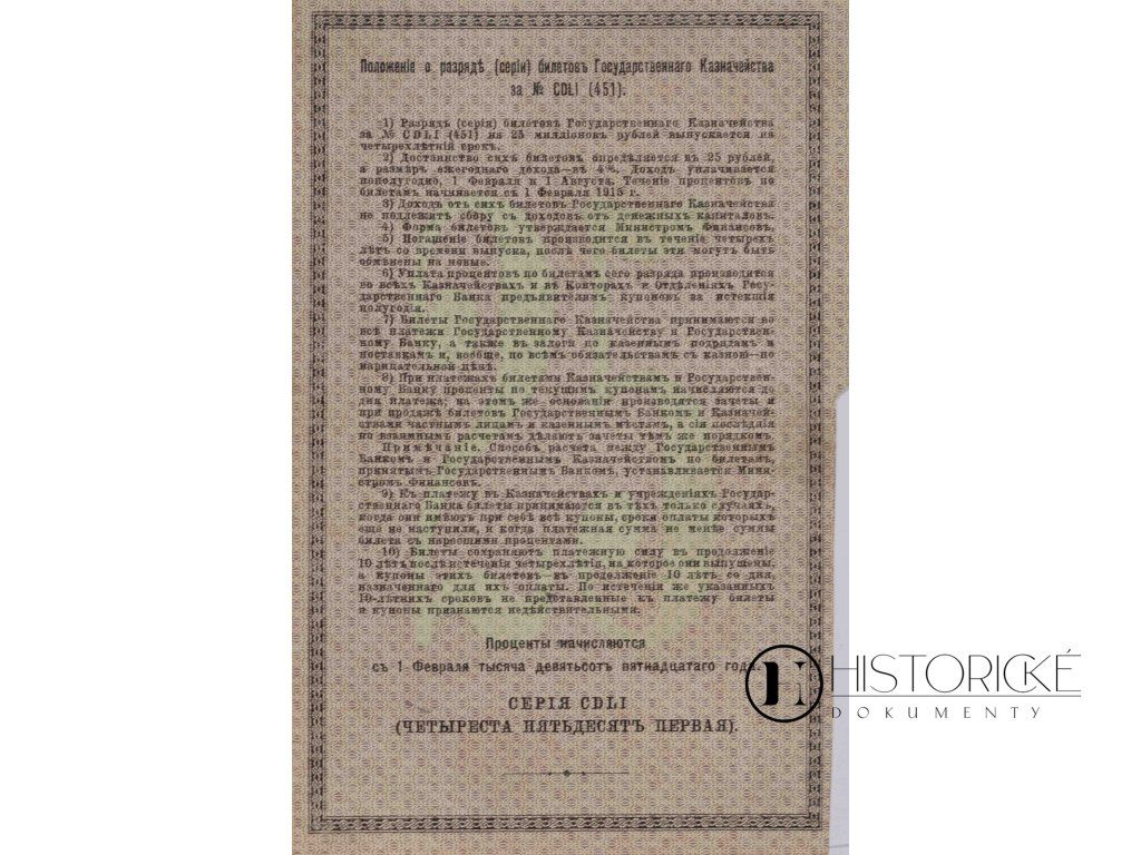Emise čítala 25 milionů rublů na čtyřletý termín, úrok 4 % vyplácen pololetně vždy k 1. únoru a 1. srpnu od roku 1915. Listina jest podepsána správcem Státní komise pro splacení dluhů, ředitelem G. Krunikovem a účetním. Na rubu jsou úplné stanovy série CDLI. Bilet jest tištěn v sytě zelené barvě s jemným ornamentálním rámem a carským dvouhlavým orlem