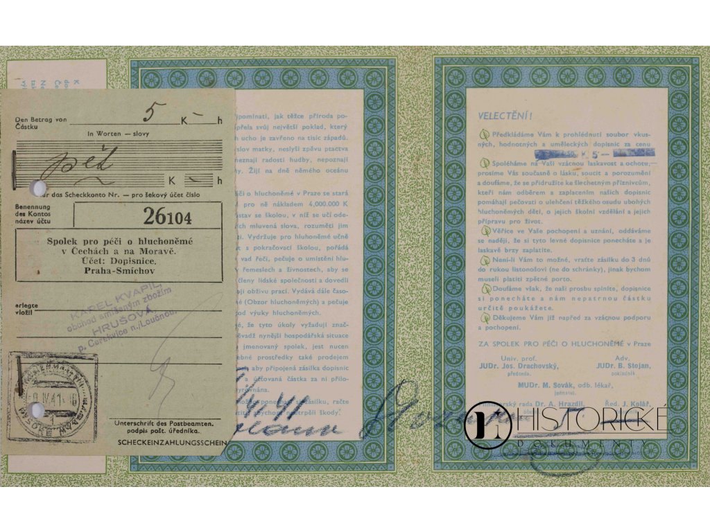 Brožura charitativní Spolku pro péči o hluchoněmé, ústavu dobročinného sídlem v Praze na Smíchově, vydaná léta 1941, v dobách protektorátních. Ke knížečce připevněna jest složenka poštovní k zasílání darů milosrdných. Spolek tento pečoval o osoby hluchoněmé, jimž osud sluch i řeč odepřel, a staral se o vzdělávání jejich i zaopatření v životě. Lidumilové čeští i v časech nejtěžších nezapomínali na bližní své trpící a almužnou štědrou pomáhali. Smíchov, čtvrť průmyslná při Vltavě, institucí dobročinných několik hostil. Vzácná památka na péči sociální a charitu českou za okupace německé, pro sběratele dokumentů spolkových