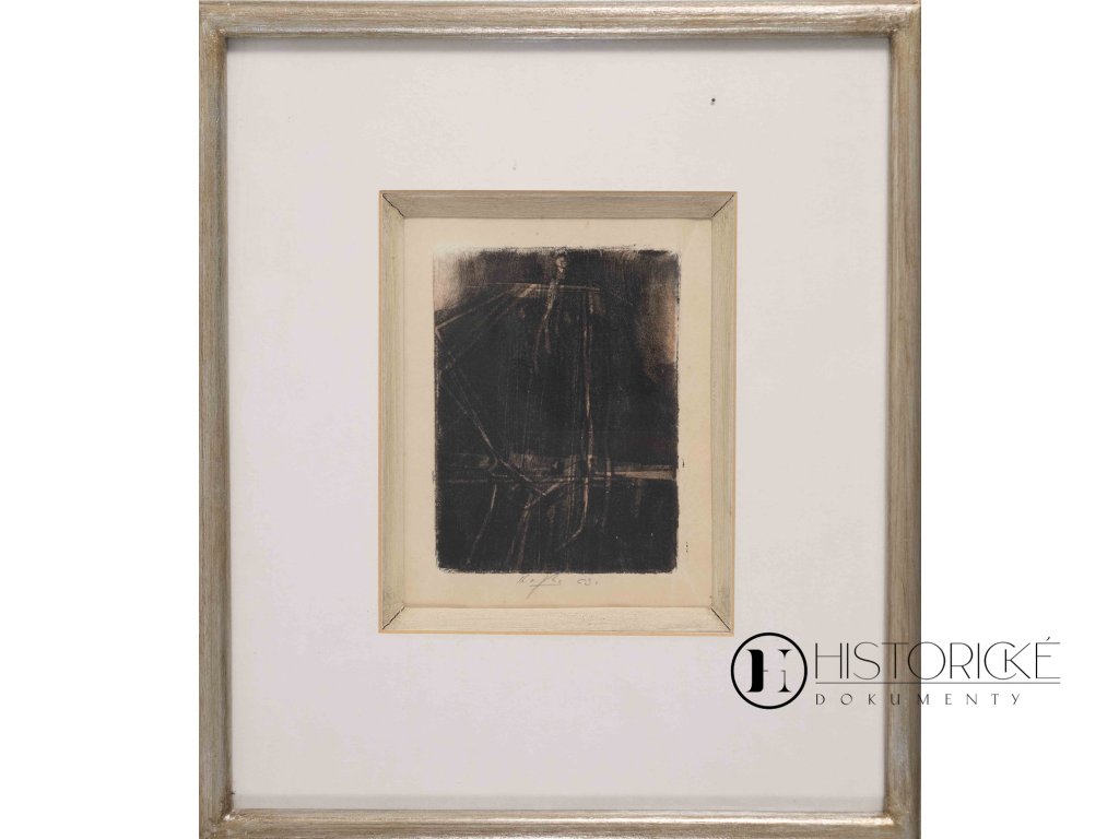 Umělecký lept Čestmíra Kafky s názvem "Figura" z roku 1963, rámovaný pod sklem firmou V. Brůžek s paspartou. Dílo jest signováno tužkou "Kafka 63". Jedná se o autentické dílo významného českého malíře a grafika Čestmíra Kafky (1922-1988), představitele moderního českého umění. Lept zachycuje lidskou figuru v charakteristickém stylu tohoto významného umělce. Dílo vzniklo v období vrcholné tvorby Kafkovy během šedesátých let. Kvalitní rámování od V. Brůžka dodává dílu odpovídající prezentaci. Výtečná památka české poválečné grafiky a umělecké tvorby druhé poloviny 20. století.