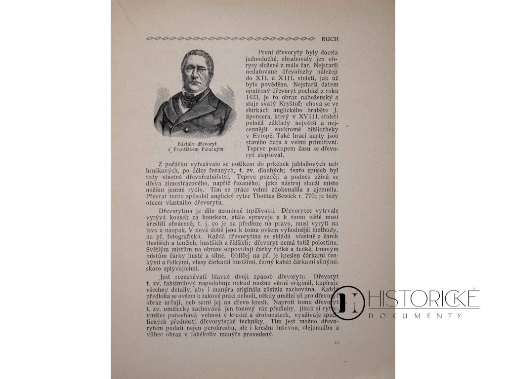 Vzácný kompletní ročník I. časopisu "Ruch" z let 1912-1913, čísla 1-10, obsahující 264 stran. Tento studentský časopis pořádal F. Strejček a vydával prestižní nakladatel F. Topič. Jedná se o autentický historický pramen z období před vypuknutím Velké války, jenž zachycuje myšlení a zájmy tehdejší studující mládeže. Časopis představuje vzácnou bibliofílii a důležitý dokument českého kulturního života počátku 20. století. Neocenitelný materiál pro badatele dějin českého školství, studentského hnutí a intelektuálních proudů předválečné doby.