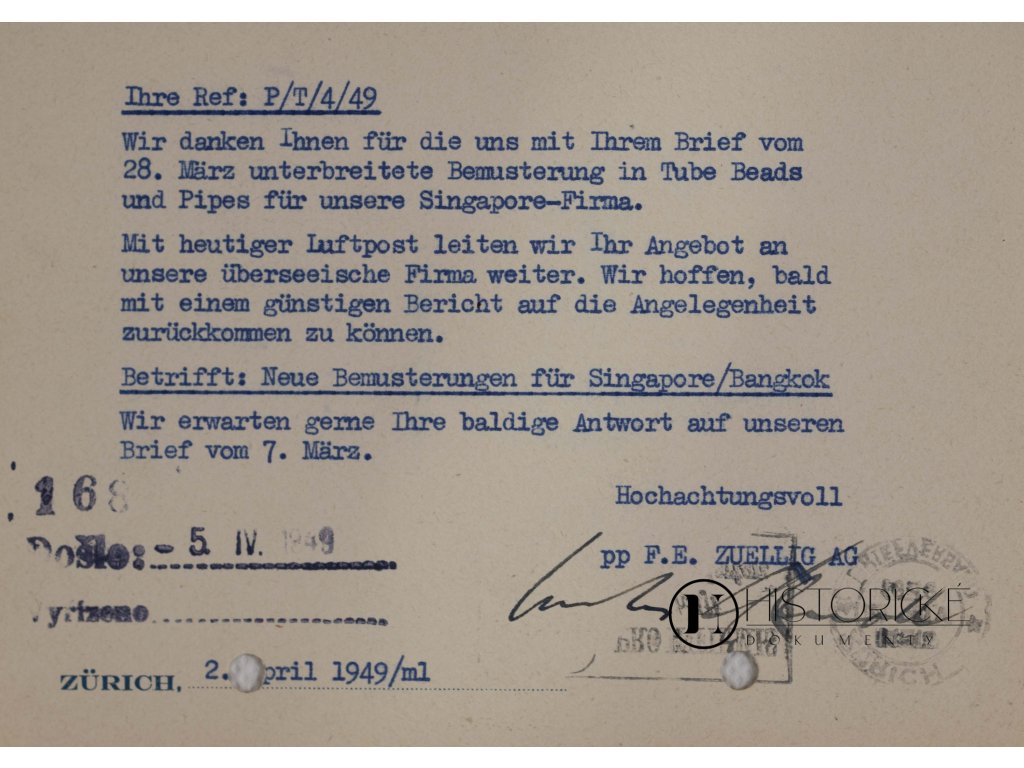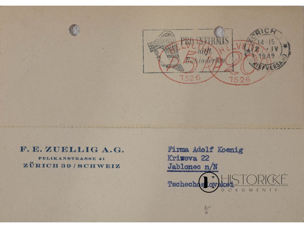Historická švýcarská celina (dopisnice) firmy "F. E. Zuellig A. G." ze Zurichu ze dne 2. dubna 1949, prošlá poštou se známkou a příležitostným razítkem. Jedná se o autentický dokument z oblasti švýcarské obchodní korespondence poválečného období. F. E. Zuellig A. G. představovala švýcarskou obchodní společnost sídlící v Zurichu, významném finančním a obchodním centru. Celina zachycuje obnovení mezinárodních obchodních kontaktů po druhé světové válce v roce 1949. Příležitostné razítko dodává filatelistickou hodnotu. Neocenitelný materiál pro sběratele švýcarských celin a badatele poválečného obchodu.