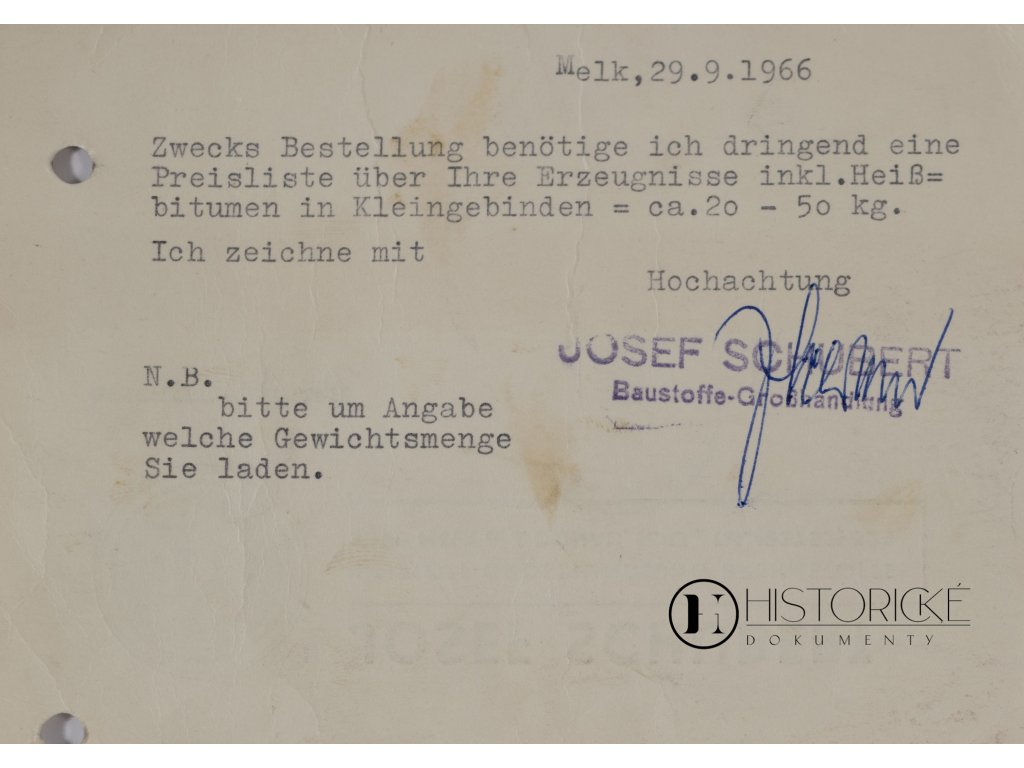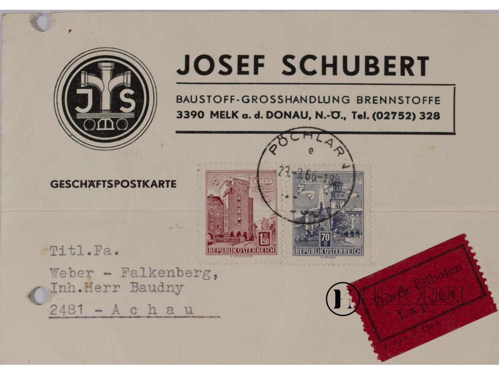 Celina (dopisnice) firmy Josef Schubert z roku 1966, specializované na "Baustoff - Grooshandlung Brennstoffe" (velkoobchod stavebními materiály a palivy) v Melku na Dunaji (Mel a.d. Donau). Dopisnice jest prošlá poštou se známkou a razítkem. Jedná se o autentický historický dokument z oblasti rakouského stavebního průmyslu šedesátých let 20. století. Celina představuje kombinaci filatelistického a obchodního materiálu, jenž svědčí o fungování rakouského velkoobchodu s palivy. Neocenitelná památka pro sběratele rakouských celin a badatele průmyslových dějin.