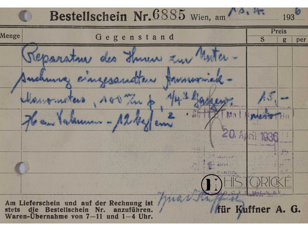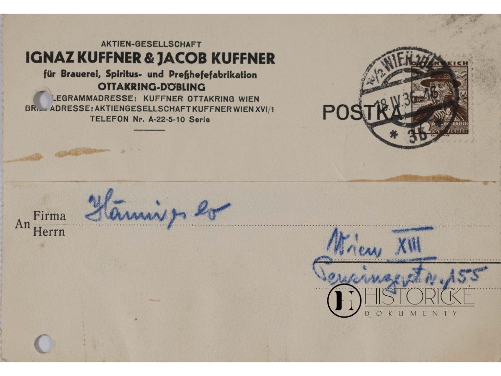 Historická celina (dopisnice) firmy "Ignaz Kuffner & Jacob Kuffner" z vídeňských čtvrtí Ottakring a Döbling z roku 1936. Dopisnice jest prošlá poštou se známkou a razítkem. Jedná se o autentický dokument rakouského obchodního života třicátých let 20. století. Firma Kuffner představovala významný vídeňský obchodní subjekt s pobočkami v těchto dvou městských částech. Celina svědčí o fungování rakouského podnikání v období před Anšlusem. Zajímavá kombinace filatelistického a obchodního materiálu z předválečné Vídně. Neocenitelná památka pro sběratele rakouských celin a badatele vídeňských obchodních dějin.