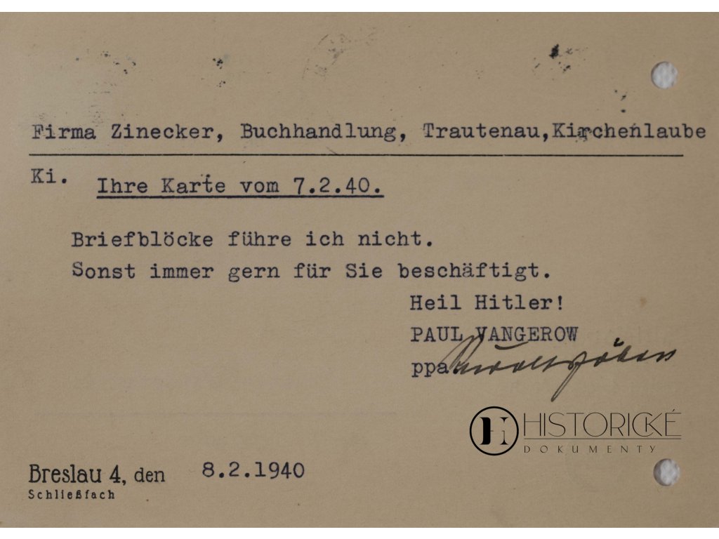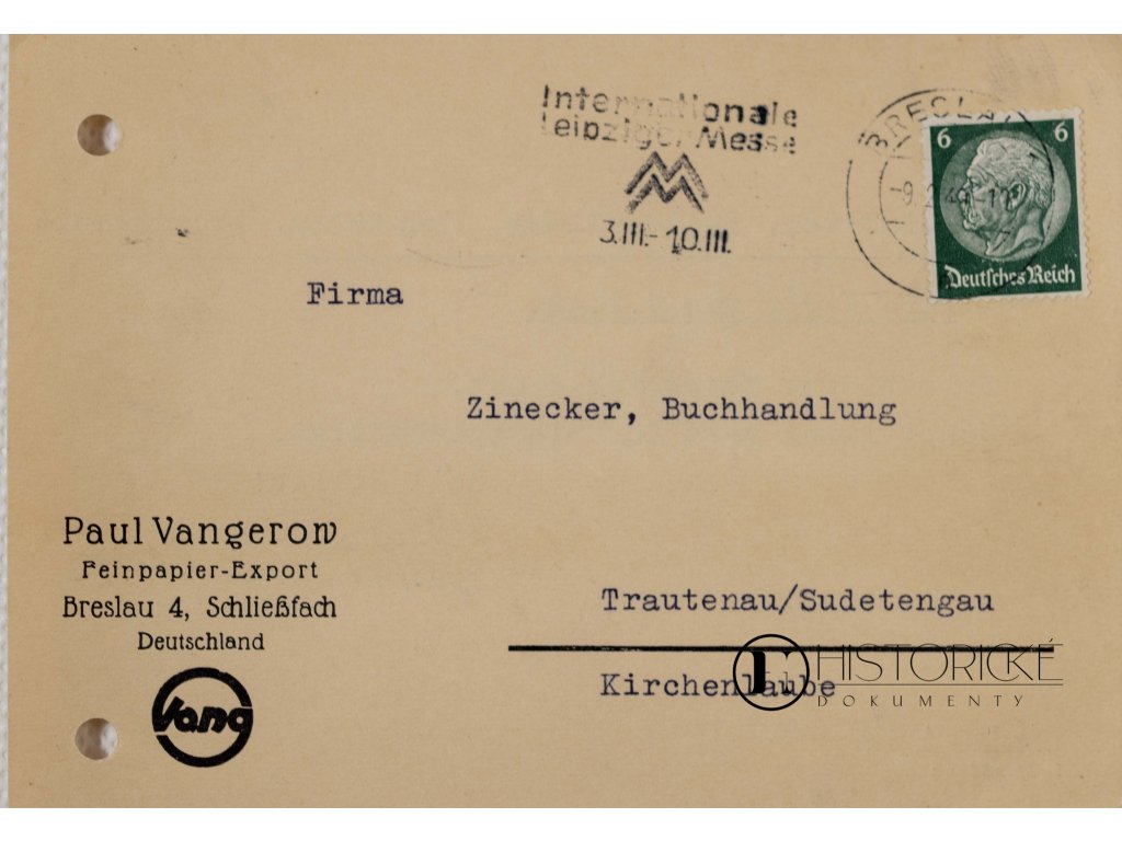 Historická celina (dopisnice) firmy "Paul Vangerow - Peinpapier - Export" z Breslavy (Vratislav) z roku 1940. Dopisnice jest prošlá poštou se známkou a razítkem. Jedná se o autentický dokument německého obchodního života z období druhé světové války. Firma se specializovala na export speciálního papíru ("Peinpapier"). Breslau (dnešní Vratislav) byl významným obchodním centrem Slezska. Celina představuje kombinaci filatelistického a obchodního materiálu z dramatického roku 1940. Neocenitelný materiál pro sběratele německých celin a badatele obchodních dějin válečného období. Zajímavý dokument fungování německého exportu během války