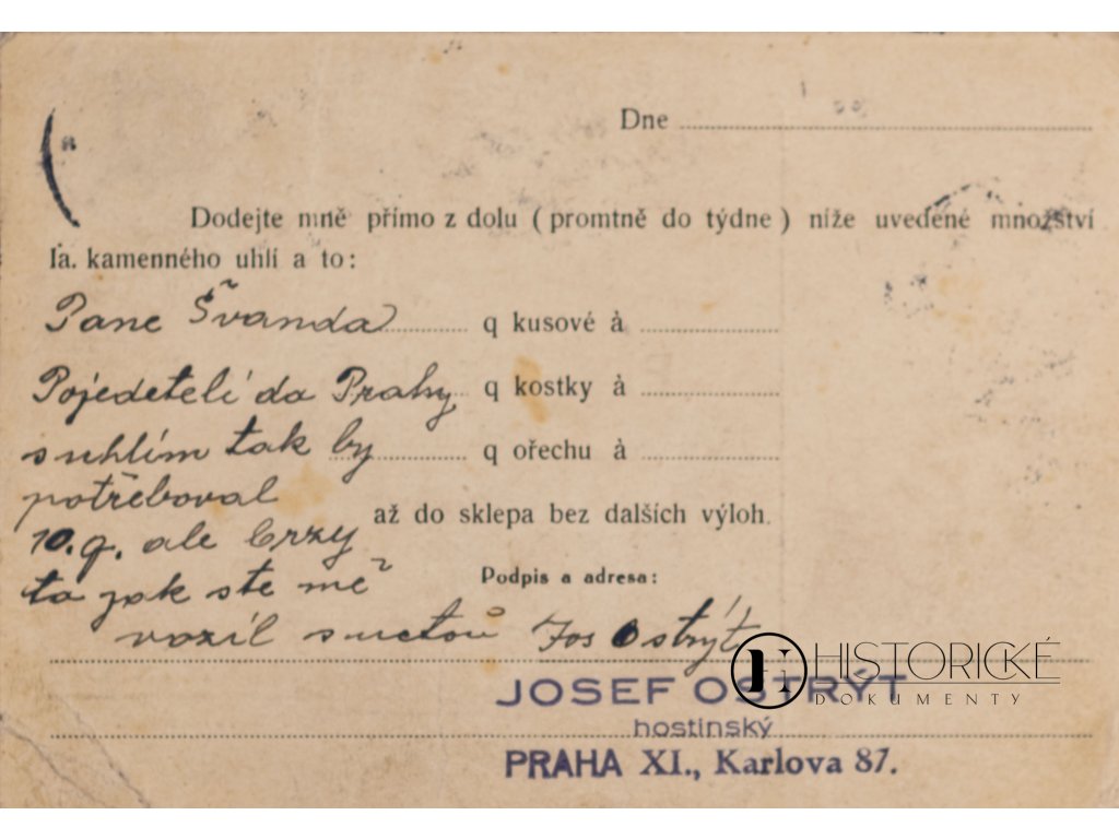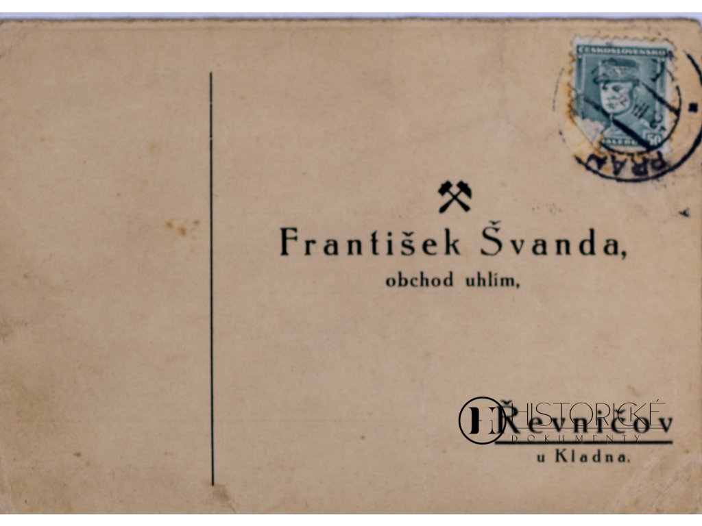 Poštovní celina firmy F. Švanda, obchodu uhlím z léta Páně 1935, v době předválečnéválečné vydaná. Jest to dokument nadmíru cenný, dokumentující obchod se surovinou pro chod průmyslu i domácností nepostradatelnou. Artefakt tento poskytuje vzácné svědectví o distribuci paliva strategického v době protektorátní, kdy "černé zlato" bylo ( a je i dnes) artiklem životně důležitým pro život obyvatelstva.