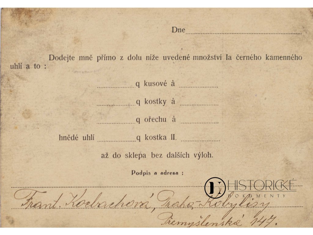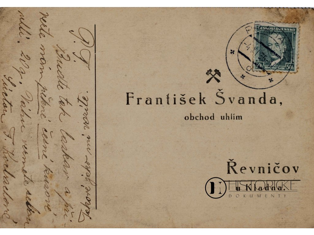 Poštovní celina firmy F. Švanda, obchodu uhlím z léta Páně 1936, v době předválečnéválečné vydaná. Jest to dokument nadmíru cenný, dokumentující obchod se surovinou pro chod průmyslu i domácností nepostradatelnou. Artefakt tento poskytuje vzácné svědectví o distribuci paliva strategického v době protektorátní, kdy "černé zlato" bylo ( a je i dnes) artiklem životně důležitým pro život obyvatelstva.