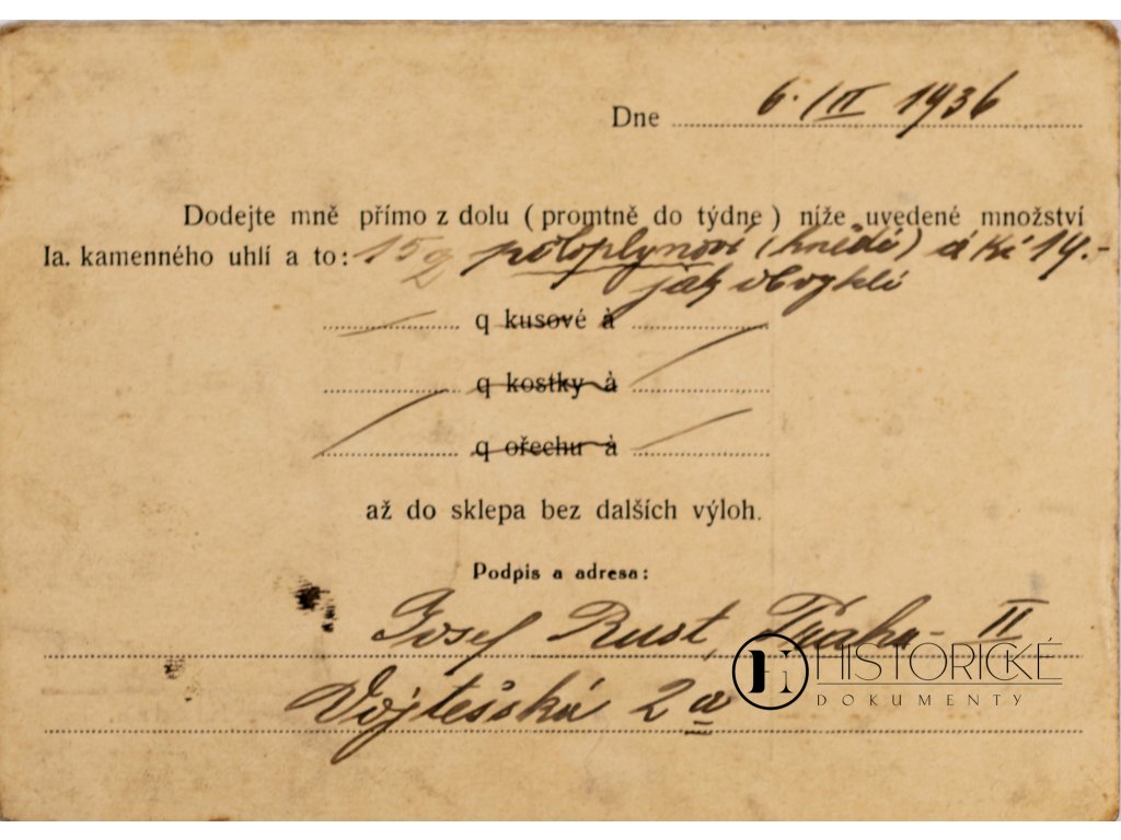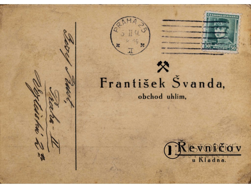 Poštovní celina firmy F. Švanda, obchodu uhlím z léta Páně 1936, v době předválečnéválečné vydaná. Jest to dokument nadmíru cenný, dokumentující obchod se surovinou pro chod průmyslu i domácností nepostradatelnou. Artefakt tento poskytuje vzácné svědectví o distribuci paliva strategického v době protektorátní, kdy "černé zlato" bylo ( a je i dnes) artiklem životně důležitým pro život obyvatelstva.