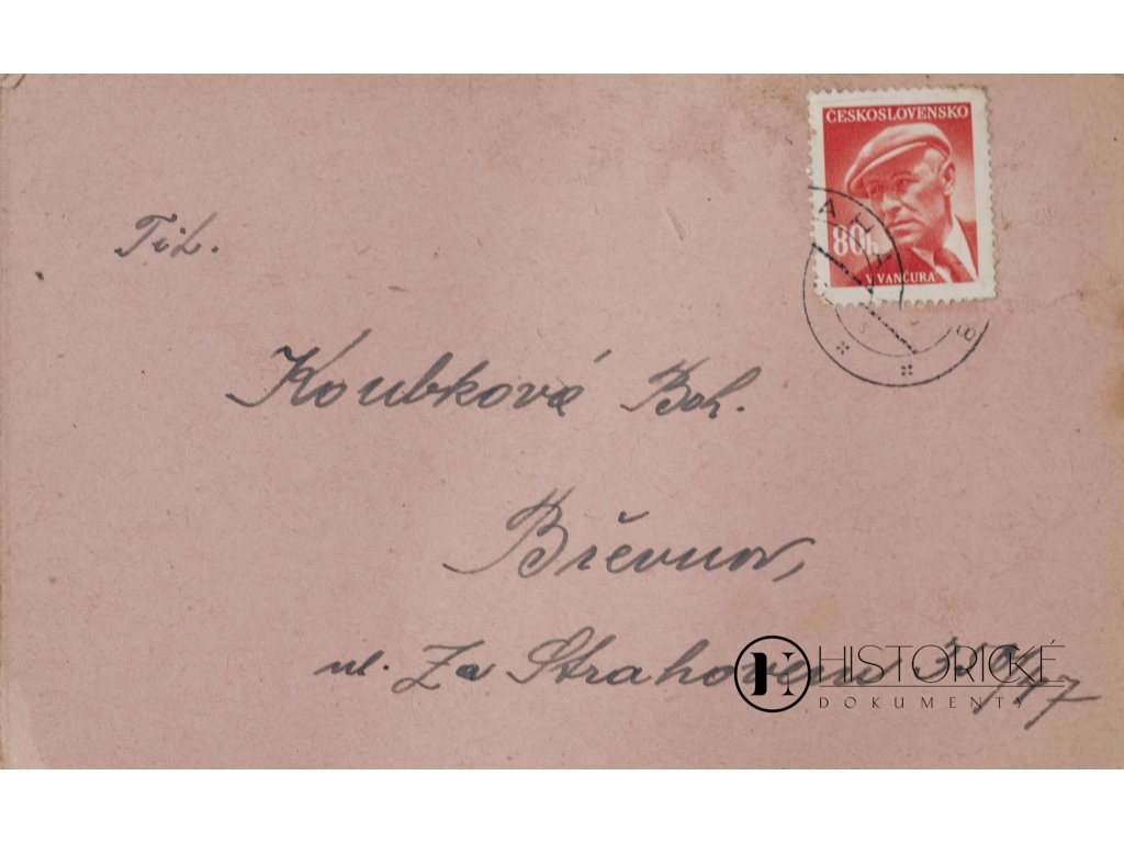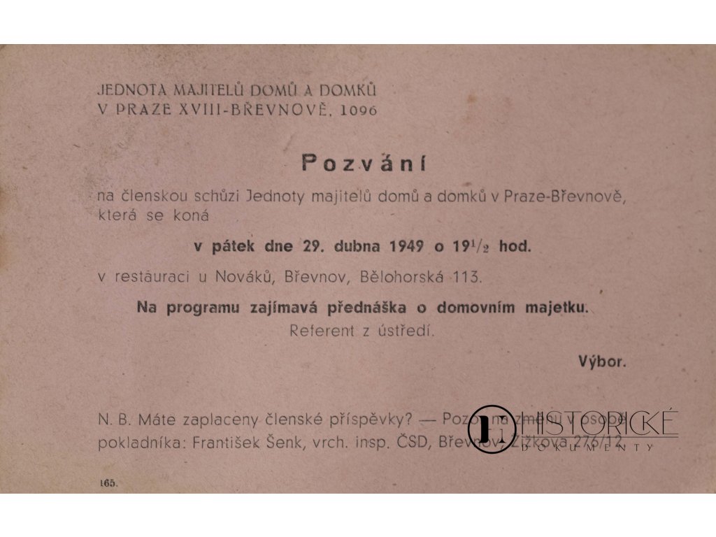 Historická celina - pozvání na členskou schůzi Jednoty majitelů domků v Praze XVII - Břevnově, číslo 1096, ze dne 29. dubna 1949, opatřená známkou a razítkem. Jedná se o autentický dokument z oblasti československého bytového družstevnictví a spolkové činnosti z prvního roku komunistické vlády. Jednota majitelů domků představovala organizaci vlastníků nemovitostí v břevnovské čtvrti Prahy. Celina zachycuje fungování občanských spolků v době politických změn po únoru 1948. Neocenitelný materiál pro sběratele pražských celin a badatele dějin družstevního bydlení. Zajímavá památka břevnovského spolkového života.