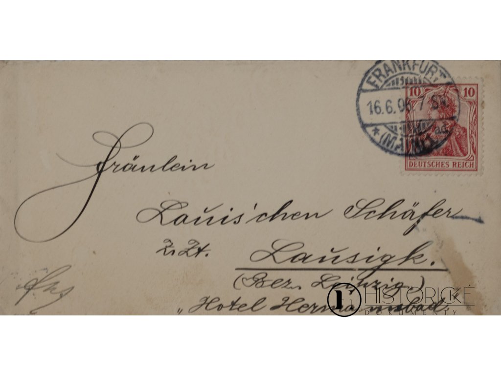 Poštovní celistvost obálka z Frankfurtu z 16. června léta Páně 1896, ofrankovaná známkou a opatřená razítkem, adresovaná do Lipska (Leipzig). Tento autentický dokument pochází z období Německé říše za vlády císaře Viléma II. a dokumentuje poštovní styk mezi významnými německými městy. Frankfurt nad Mohanem a Lipsko byly důležitými obchodními a kulturními centry. Obálka dokládá fungování poštovní služby v císařském Německu a způsob frankovacích postupů v devadesátých létech devatenáctého století. Razítka a známky představují cenné svědectví o poštovní historii. Pro sběratele německé filatelie a badatele o poštovních dějinách představuje vzácnou památku na každodenní korespondenci a obchodní styk mezi městy v době rozkvětu Německé říše před první světovou válkou.