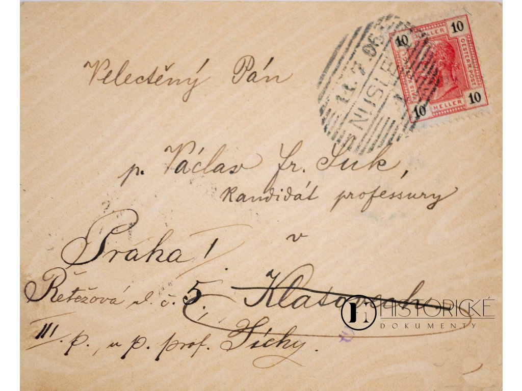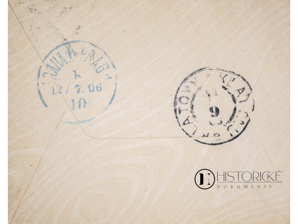 Poštovní dokument, celistvost - malá obálka z počátku dvacátého století. Opatřena jest poštovní známkou tehdejší doby a úředním razítkem, jež datum a místo odeslání dokládá. Obálka tato, rukou adresovaná, cestou poštovní doručena byla svému příjemci v době, kdy psaný list hlavním prostředkem komunikace na dálku byl. Dokument tento vzácným jest svědectvím poštovních zvyklostí za pozdních dob c. k. mocnářství či rané republiky a cenným artefaktem pro sběratele filatelistických pokladů