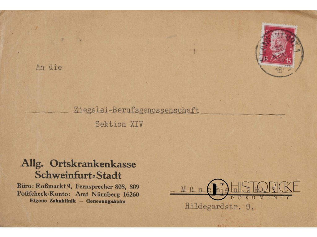 Poštovní celistvost Všeobecné místní nemocenské pokladny města Schweinfurtu, odeslaná roku 1928 do Mnichova. Schweinfurt, průmyslové město ve Francích proslulé výrobou kuličkových ložisek, hostilo nemocenské pokladny pečující o zdraví dělnictva továrního. Nemocenské pojištění zavedené Bismarckem v osmdesátých letech století devatenáctého patřilo k základům sociálního státu německého. Obálka firemní s předtištěnou hlavičkou Allg. Ortskrankenkasse Schweinfurt-Stadt dokládá úřední korespondenci pojišťovací správy výmarské republiky. Ofrankována jednou známkou dobovou, opatřena poštovním razítkem schweinfurtským. Adresováno do Mnichova, patrně ústředí či jinému úřadu pojišťovacímu. Celistvost zachována kompletní, známka i razítko zřetelné