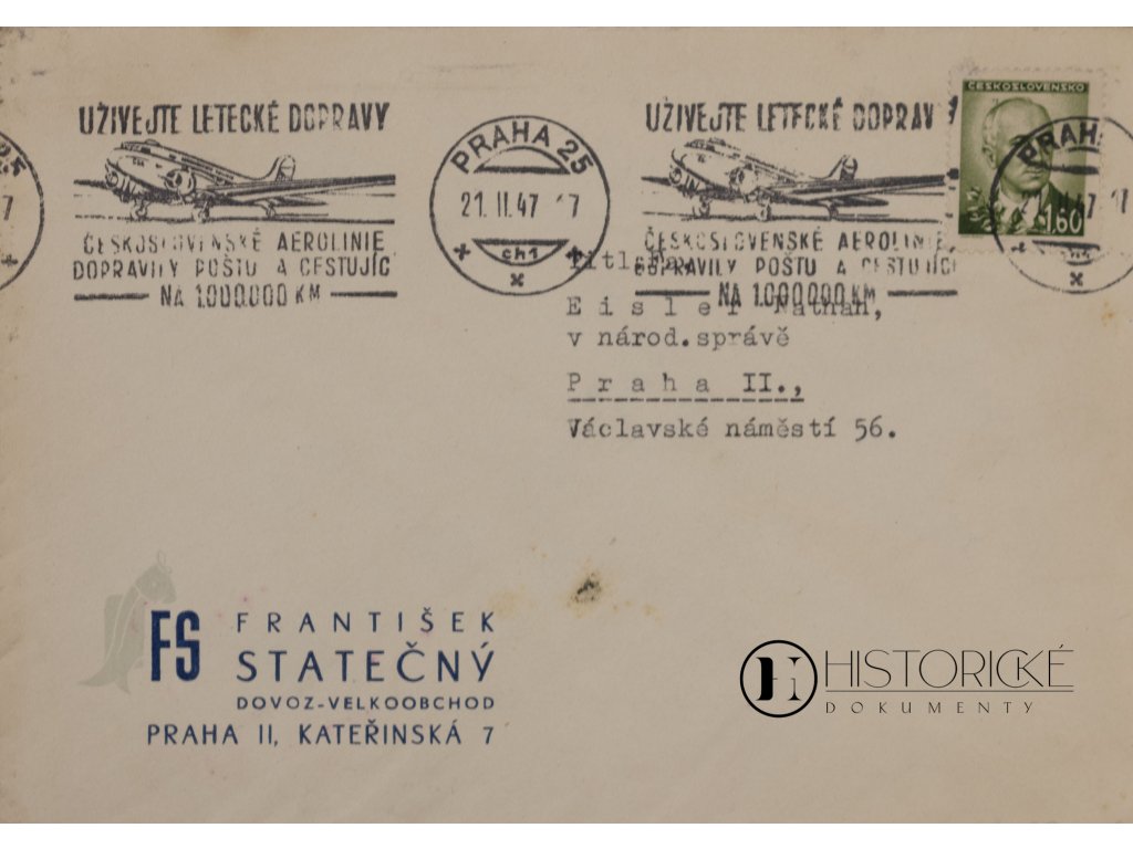 Celistvost obchodní korespondence firmy František Statečný, dovoz a velkoobchod, ofrankovaná a řádně prošlá poštou dne 21. listopadu léta Páně 1947. Listovní zásilka jest ozdobena příležitostným razítkem Československých aerolinií, jež v oněch časech poprvé rozpínaly svá křídla nad světadíly. Razítko jest obtisknuto jasně a čitelně, známka pevně přiléhá k papíru. Celistvost dokládá čilý obchodní ruch poválečných Čech a jest vzácným svědectvím doby, kdy obchod i vzduchoplavba opětně nabývaly své zašlé slávy. Stav pěkný, zachovalý.