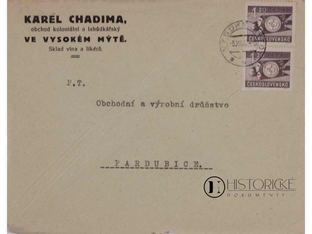 Poštovní celistvost firemní od Karla Chadimy, jenž provozoval obchod koloniální a lahůdkářský ve Vysokém Mýtě, městě starobylém v kraji východočeském při řece Loučné, odeslaná dne 5. prosince léta 1947. Obálka prošla poštou, opatřena jest známkou i razítkem poštovním. Obchody koloniální a lahůdkářské nabízely zboží vybrané – kávu, čaj, koření exotické, čokoládu, sardinky i pochutiny rozmanité, jimiž stoly měšťanské se zdobily. Vysoké Mýto, rodiště slavného konstruktéra Klose, mělo obchodníků zdatných. Doba poválečná přinesla naděje nové, leč brzy znárodnění přišlo. Vzácná památka obchodního života poválečného Československa.