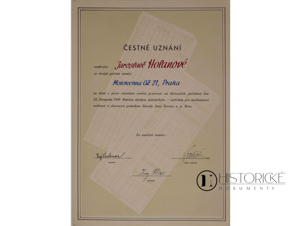 Historické čestné uznání ze soutěže pracovnic na děrovačích z roku 1959, udělené soudružce děrující na děrovači typu Aritma M14 v Mototechně OZ 21 Praha, opatřené razítkem Českého úřadu statistického a Závodů Jana Švermy n.p. Brno. Jedná se o autentický dokument z oblasti československého průmyslu a socialistické soutěže práce padesátých let. Děrovací stroje sloužily pro zpracování dat v administrativě. Soutěže pracovnic představovaly typický prvek komunistické pracovní kultury. Neocenitelný materiál pro badatele dějin československého průmyslu a socialistického pracovního prostředí. Zajímavá památka období centrálního plánování a průmyslové mechanizace.