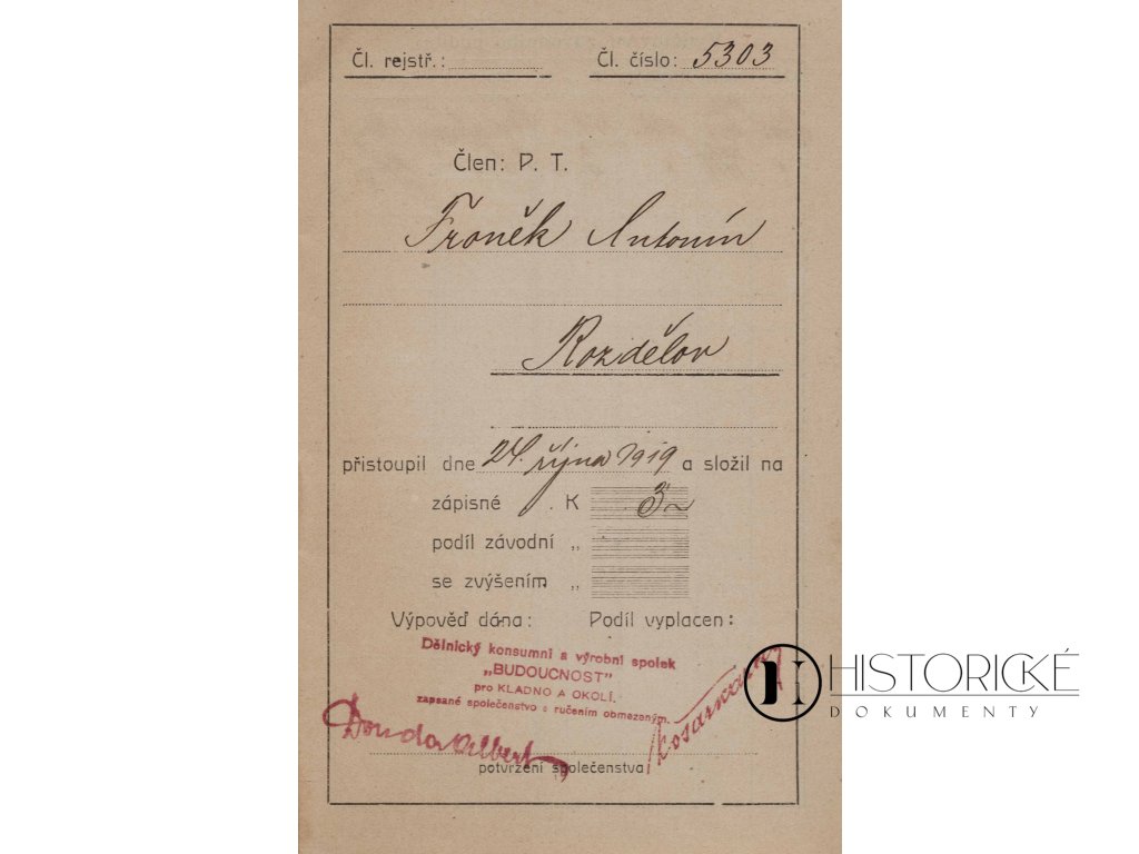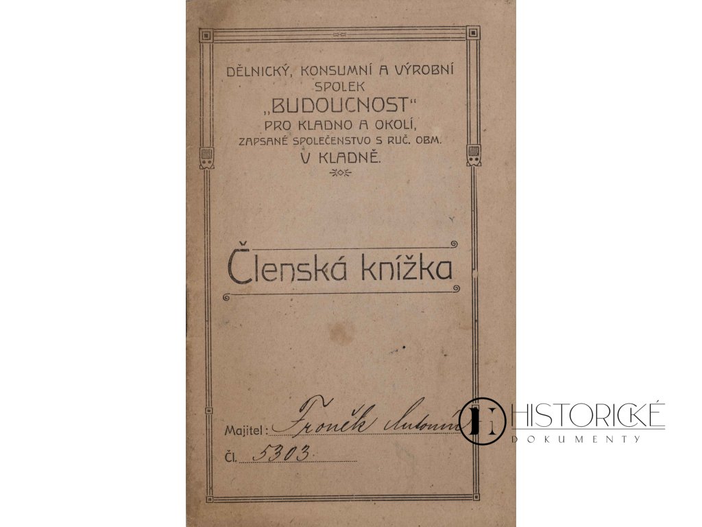 Členská knížka dělnického, konsumního a výrobního spolku Budoucnost pro Kladno a okolí, vydaná dne 24. října léta Páně 1919. Knížka evidenční číslo 5303 čítá dvacet a dvě strany a dokládá členství v družstvu, jež bylo zřízeno ku prospěchu dělnictva kladenského. Dokument tento jest vzácným svědectvím doby rozmachu družstevního hnutí v mladé republice československé a hospodářských snah třídy dělnické. Zachovalost výtečná, stránky neporušeny. Pro sběratele dokumentů historických i badatele dějin sociálních artefakt nevšední hodnoty.