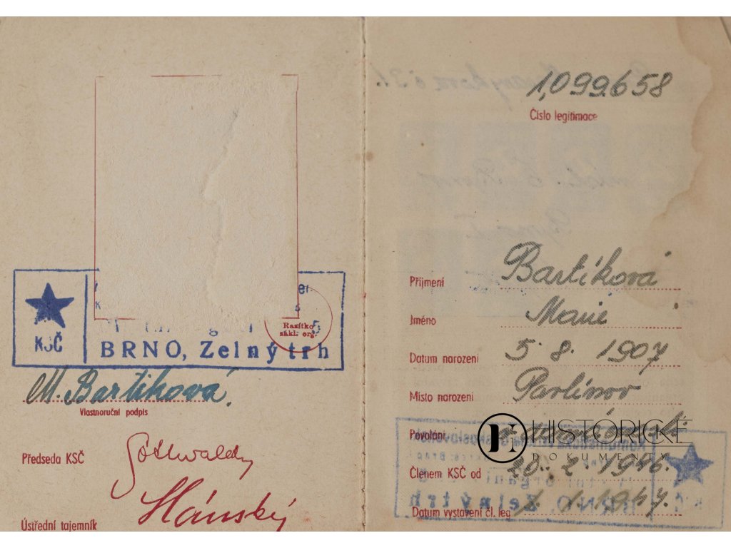Členská legitimace Komunistické strany Československa z Brna, vydaná léta Páně 1946, krátce po skončení války veliké. Tento historický dokument obsahuje 16 stran a nese vlepené členské známky z let 1946 až 1950, což svědčí o pravidelném placení příspěvků stranických. Původní fotografie majitele jest odlepena, avšak dokument zachován jest s razítky úředními a ověřeními. Legitimace pocházející z doby před únorem 1948 představují vzácné svědectví o období krátké demokracie a nástupu totality komunistické. Pro sběratele historických dokumentů a badatele o dějinách XX. století jest toto unikátní památka na éru, která zásadně poznamenala osudy národa československého a celé střední Evropy.
