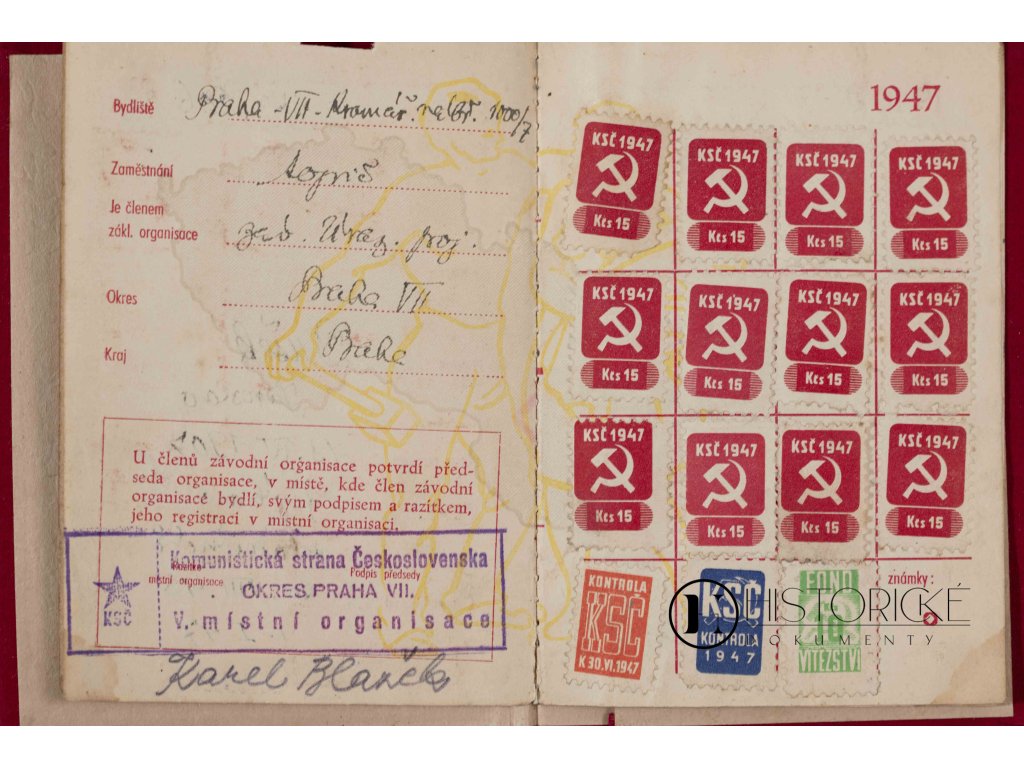 Členská legitimace Komunistické strany Československa z Prahy, vydaná léta Páně 1947, krátce po skončení války veliké. Tento historický dokument obsahuje 16 stran a nese vlepené členské známky z let 1947 až 1950, což svědčí o pravidelném placení příspěvků stranických. Původní fotografie majitele jest odlepena, avšak dokument zachován jest s razítky úředními a ověřeními. Legitimace pocházející z doby před únorem 1948 představují vzácné svědectví o období krátké demokracie a nástupu totality komunistické. Pro sběratele historických dokumentů a badatele o dějinách XX. století jest toto unikátní památka na éru, která zásadně poznamenala osudy národa československého a celé střední Evropy.