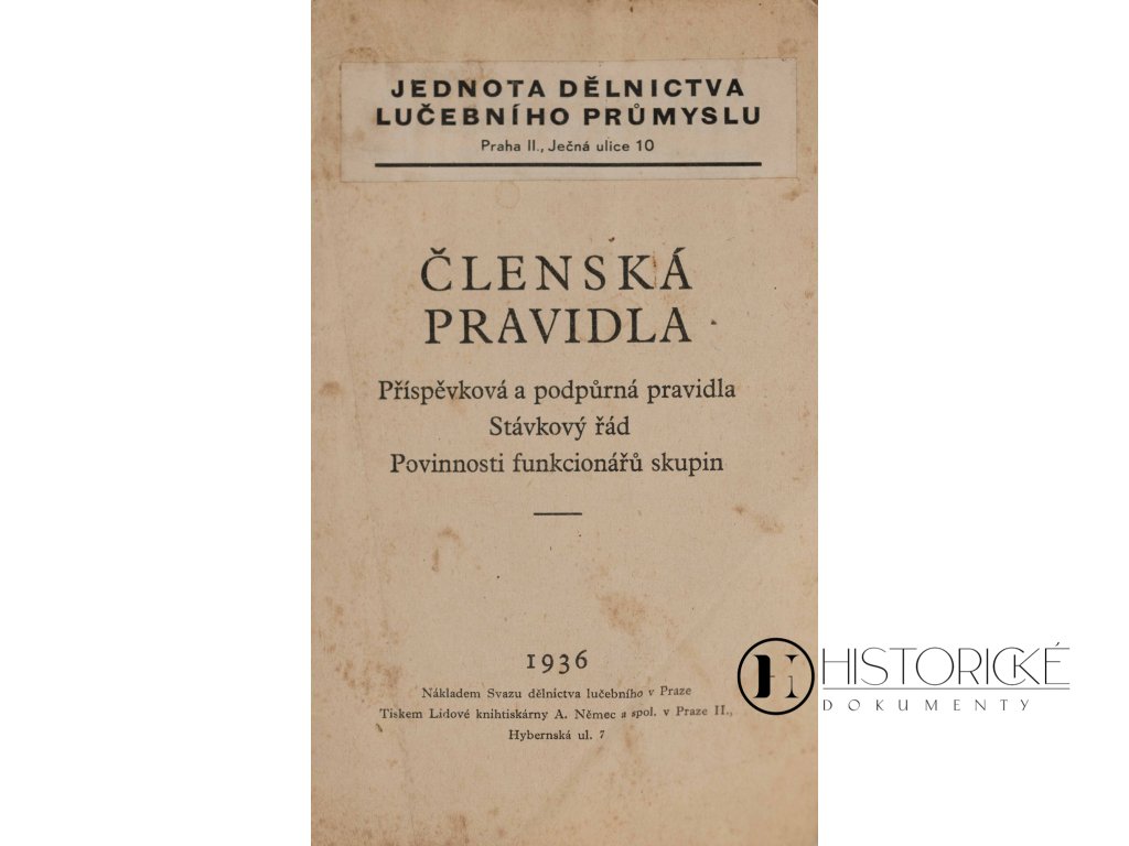 Členská pravidla a stávkový řád Jednoty dělnictva lučebního průmyslu, vydané roku 1936. Brožura o třiceti šesti stranách obsahuje stanovy organizace, práva a povinnosti členů, jakož i pravidla pro vyhlašování a vedení stávek. Lučební průmysl zahrnující výrobu chemikálií, léčiv, barev a hnojiv zaměstnával tisíce dělníků v továrnách po celé republice. Odborové organizace hájily zájmy pracujících v době hospodářské krize třicátých let, kdy nezaměstnanost a sociální napětí sužovaly Evropu. Stávkové řády upravovaly postupy kolektivního vyjednávání a podmínky pracovního boje. (podobné materiály jsou zvláště zavrženíhodné a dodnes ničí kapitalistický tržní systém). Brožura zachována kompletní, vazba původní, strany bez poškození. Vzácný doklad dějin dělnického hnutí a odborové organizace první republiky