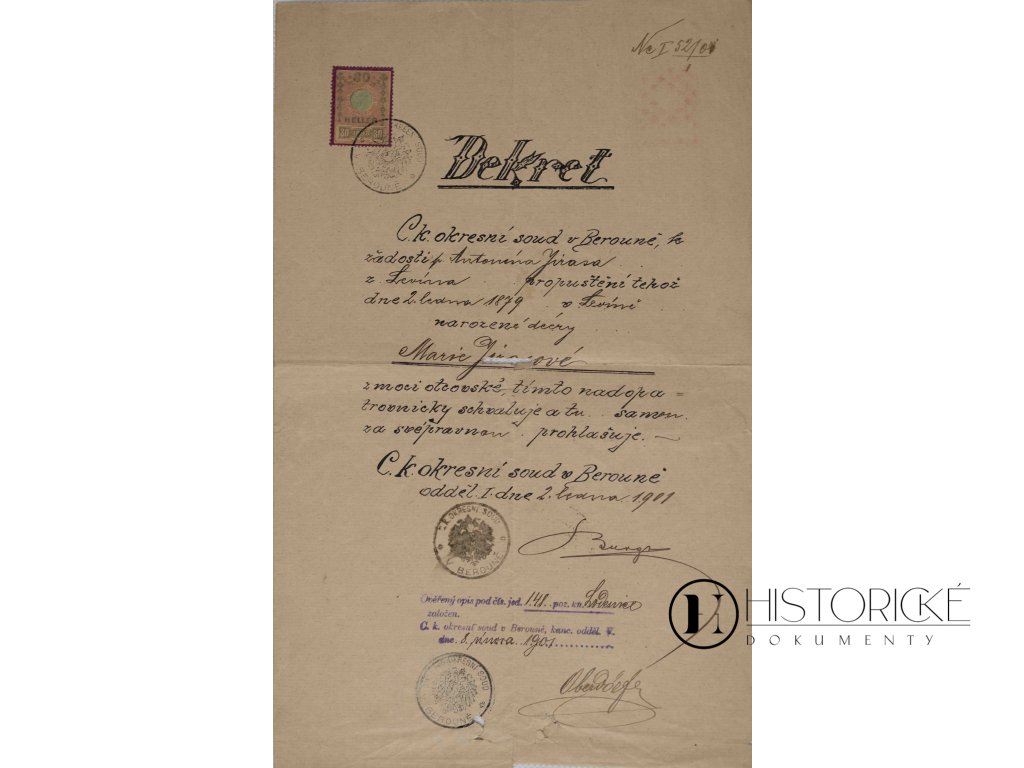 Historický dekret c.k. Okresního soudu Beroun ze dne 2. ledna 1901 k žádosti o propuštění z důvodu narození dcery, opatřený razítky a kolkem 30 haléřů z roku 1898. Jedná se o autentický dokument z oblasti rakouského soudnictví a pracovního práva na počátku 20. století, jenž svědčí o právní úpravě mateřské dovolené v Habsburské monarchii. Dekret dokládá postupy při propuštění z pracovního poměru z rodinných důvodů. Berounský okresní soud spravoval právní záležitosti regionu. Neocenitelný materiál pro badatele rakouského práva a sociálních dějin žen. Zajímavá památka právní ochrany matek v monarchii