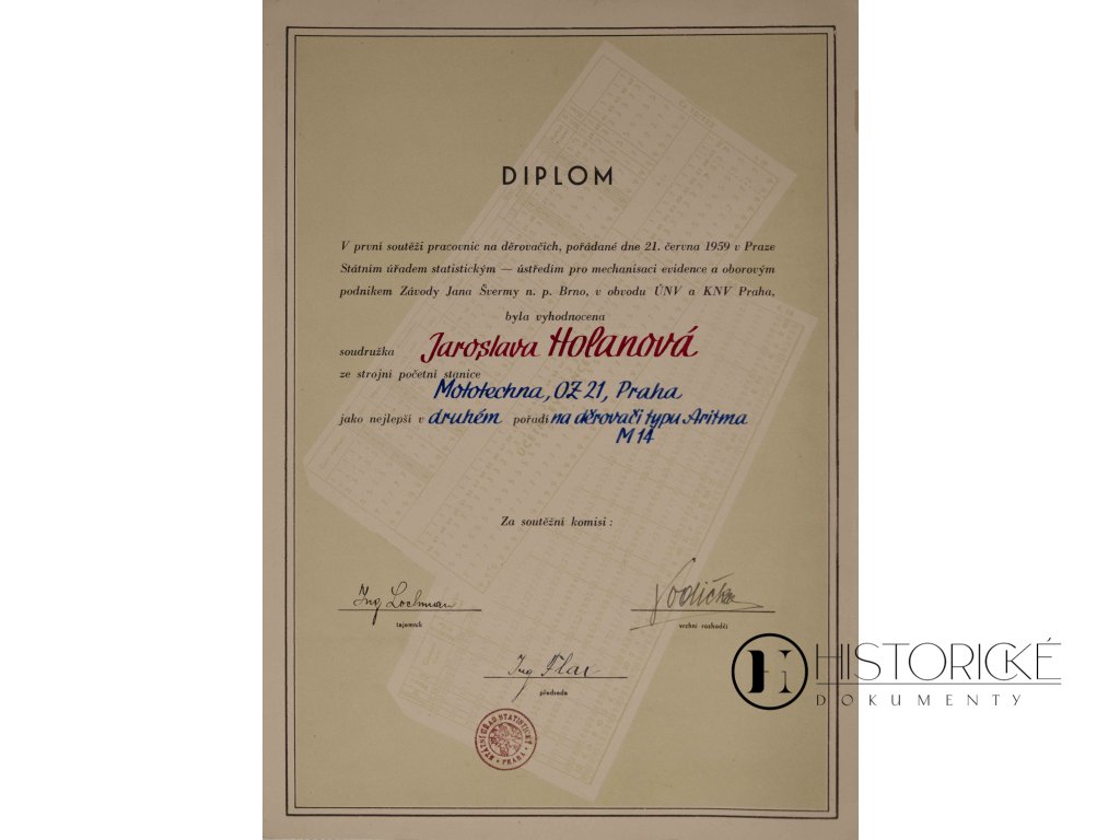Diplom, soutěž pracovnic, Mototechna, 1959