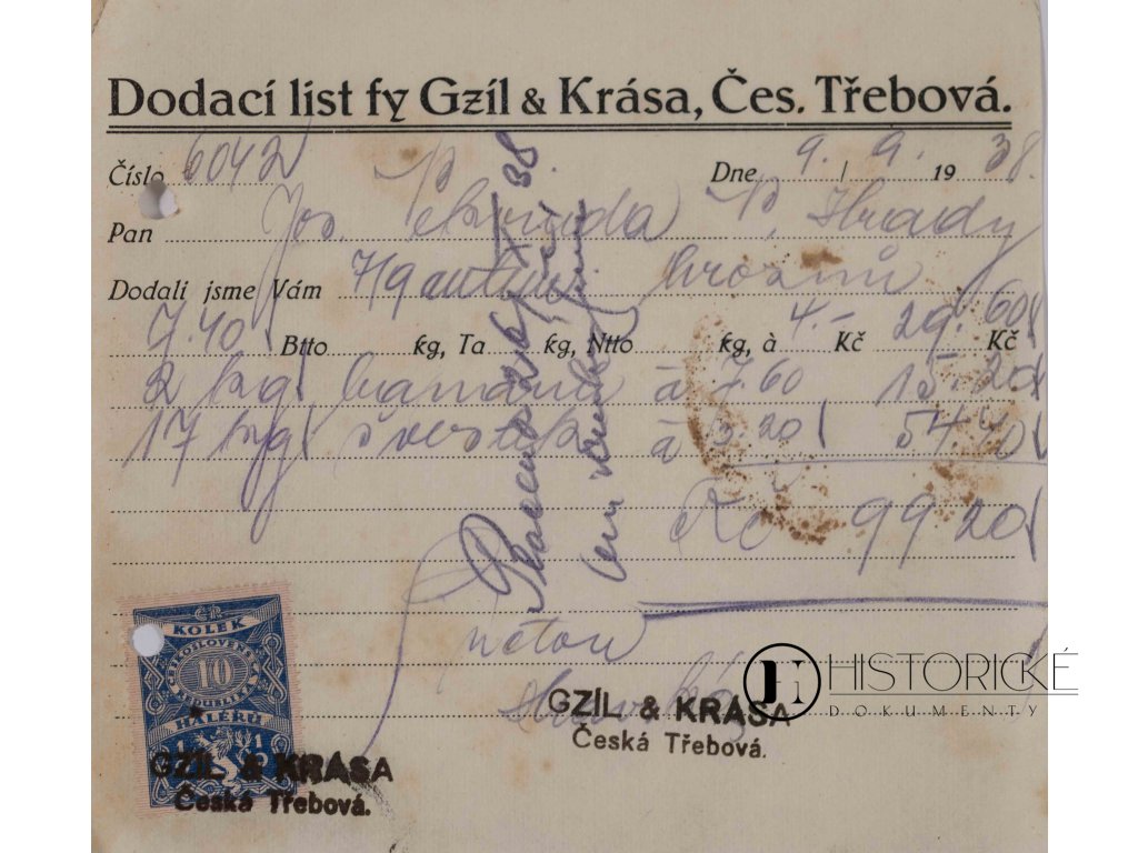Dodací list od slovutné firmy Gzíl & Krása z České Třebové, vystavený dne 9. září léta 1938, v posledních dnech klidu před bouří mnichovskou. Dokument psán jest rukou a opatřen kolkem ve výši desíti haléřů. Dodací listy sloužily k potvrzení převzetí zboží objednaného a bývaly nezbytnou součástí obchodu řádného. Česká Třebová, město železniční na rozhraní Čech a Moravy, byla křižovatkou cest obchodních, kudy zboží proudilo do všech koutů republiky. Firma pánů Gzíla a Krásy náležela k podnikům váženým kraje východočeského. Vzácný doklad obchodního styku v dobách předmnichovských první republiky Československé