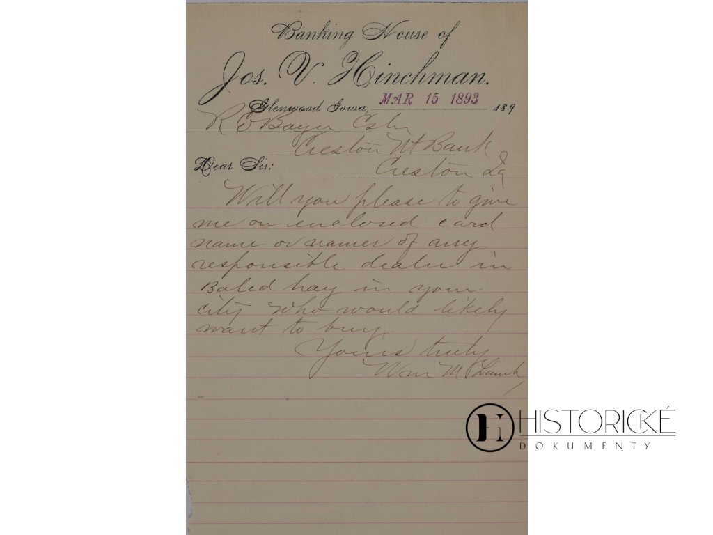Dopis obsahuje obchodní korespondenci týkající se zodpovědných dluhů v Baled Hay. Text zmiňuje možnost koupi a podepsán je "Yours truly, Wm M. Hawk". Jedná se o autentický dokument amerického bankovního života konce 19. století, jenž svědčí o mezibankovní komunikaci a obchodních transakcích v Iowa. Neocenitelný materiál pro badatele dějin amerického bankovnictví a zemědělského obchodu. Zajímavá památka rurálního bankovnictví a obchodu se senem.
