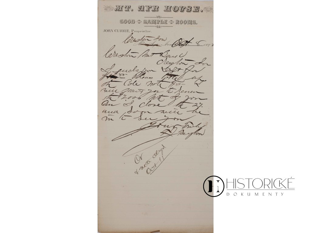 Dopis na hlavičkovém papíru hotelu "Mt. Ayr House