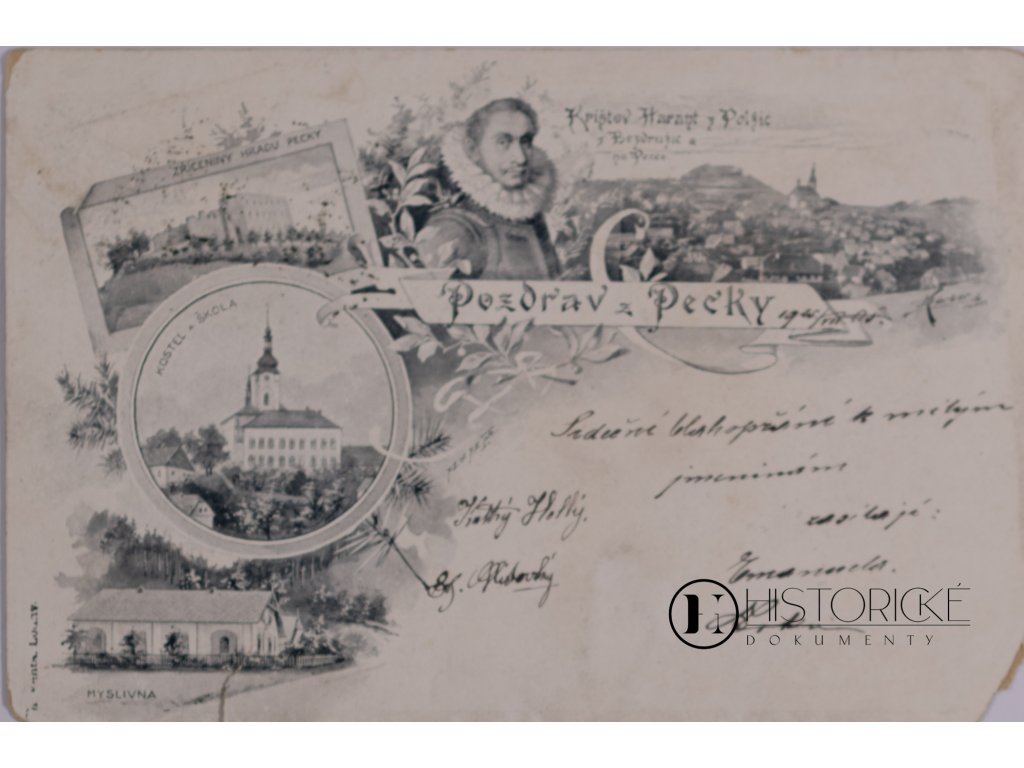 Zajímavá dopisnice s nápisem "Kryštof Harant z Polžic a Bezdružic, Pozdrav z Pečky" z roku 1895. Jedná se o dokument nadepsaný a opatřený razítkem, známka jest odlepena. Dopisnice nese jméno slavného českého renesančního šlechtice a cestovatele Kryštofa Haranta z Polžic a Bezdružic (1564-1621), autora slavného cestopisu do Svaté země a mučedníka popravy na Staroměstském náměstí. Dokument představuje zajímavou kombinaci historické osobnosti s městem Pečky. Jedná se o kuriosní filatelistický materiál připomínající významnou postavu českých dějin. Zajímavá památka pro sběratele českých dopisnic.