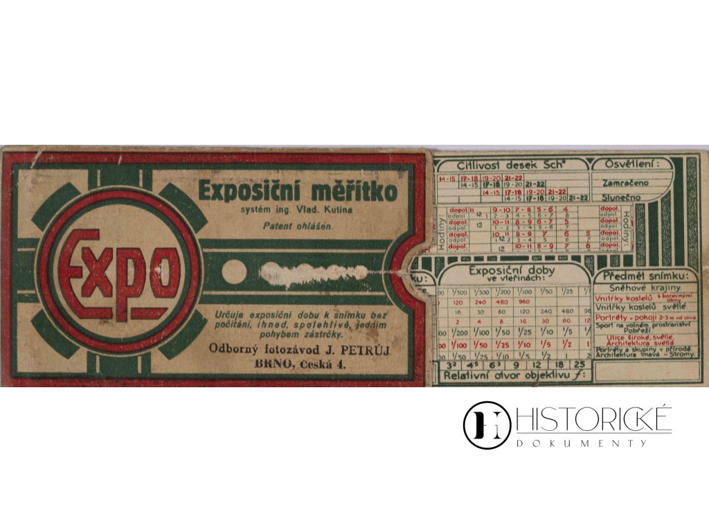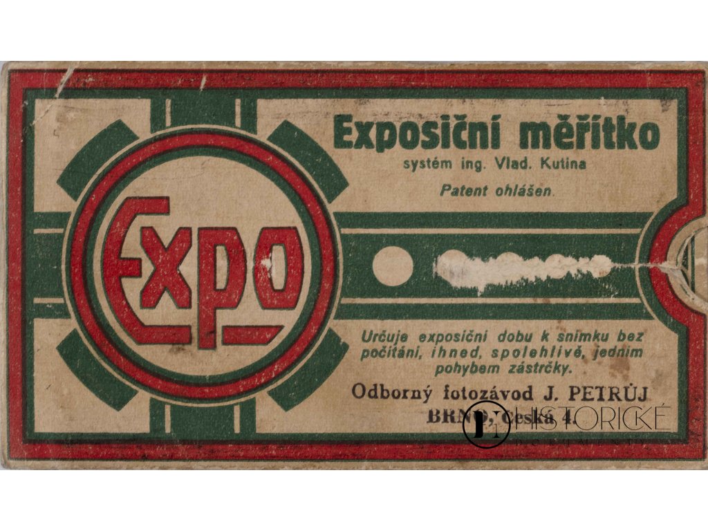 Expoziční měřítko soustavy inženýra Vladimíra Kutiny, značky Expo, pomůcka důmyslná pro fotografy amatéry i mistry světlopisu. Měřítko toto určuje dobu expoziční ke snímku bez počítání zdlouhavého, pouhým vysunutím a srovnáním stupnic. Zhotoveno jest z kartonu tvrdého, konstrukce vysouvací, aby v kapse fotografově pohodlně se vešlo a při ruce vždy bylo. V dobách, kdy exponometry elektrické nebyly, pomůcky takovéto byly nezbytností každého fotografa vážného. Inženýr Kutina svým vynálezem usnadnil práci tisícům nadšenců českých, kteří umění fotografickému se oddávali. Vzácná kuriozita pro sběratele pomůcek fotografických i dějin techniky optické.