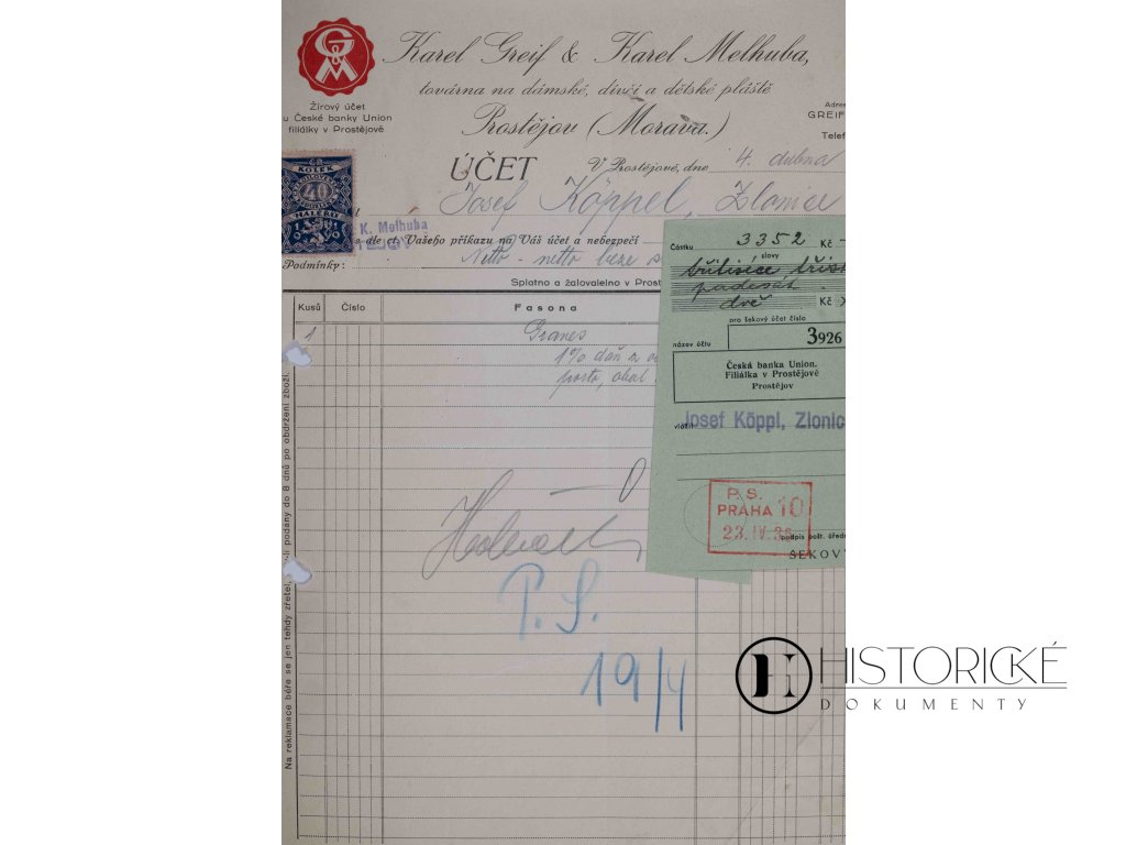 Faktura z továrny na dámské, dívčí a dětské pláště pánů Karla Greifa a Karla Melhuby v Prostějově, městě moravském proslulém průmyslem oděvním, vystavená dne 4. dubna léta 1935. Dokument opatřen jest kolkem ve výši čtyřiceti haléřů a nalepena jest složenka poštovní k úhradě faktury. Prostějov, hanácká metropole konfekce, zaměstnával tisíce švadlen a krejčích, kteří pláště a oděvy šili pro celou republiku i na vývoz. Továrny oděvní bývaly pýchou města a jména výrobců daleko za hranice pronikala. Spolupráce Greifa s Melhubou svědčí o podnikavosti zdejších živnostníků. Vzácný doklad oděvního průmyslu moravského za první republiky.