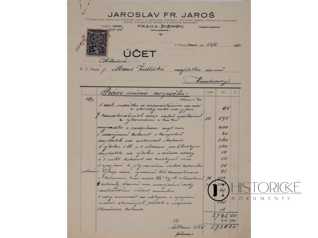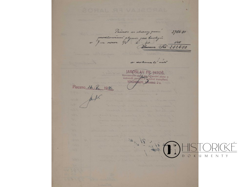 Faktura z autorizovaného závodu Jaroslava Fr. Jaroše z Prahy-Žižkova, jenž zřizoval plynové a vodovodní instalace, koupelny i zařízení sanitární, vystavená dne 23. května léta 1931. Dokument krasopisně vypraven, opatřen kolkem v hodnotě padesáti haléřů a razítkem na straně rubové. Žižkov, čtvrť dělnická a živnostenská, hemžil se řemeslníky zdatnými, kteří měšťanům pražským komfort moderní do domů zaváděli. Koupelny s vodou teplou bývaly tehdáž oznakou blahobytu a pokroku. Instalatéři autorizovaní těšili se důvěře úřadů i zákazníků. Vzácný doklad živnosti technické a stavebního ruchu prvorepublikové Prahy.