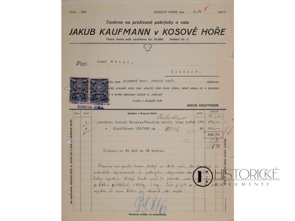 Faktura z továrny na prošívané pokrývky a vatu Jakuba Kaufmana v Kosově Hoře, vystavená dne 2. Června, léta 1936. Dokument opatřen jest kolkem ve výši dvaceti haléřů a šekovým výplatním příkazem, jenž k úhradě faktury sloužil. Kosova Hora, městečko starobylé v kraji sedlčanském, proslulo průmyslem textilním a peřinářským. Prošívané pokrývky a vata bavlněná či vlněná hřály domácnosti české v zimách mrazivých. Firma Kaufmanova náležela k podnikům váženým, jež zaměstnávaly obyvatele kraje chudého. Jméno majitelovo naznačuje původ židovský, což dokumentu dodává na významu historickém. Vzácný doklad průmyslu textilního první republiky