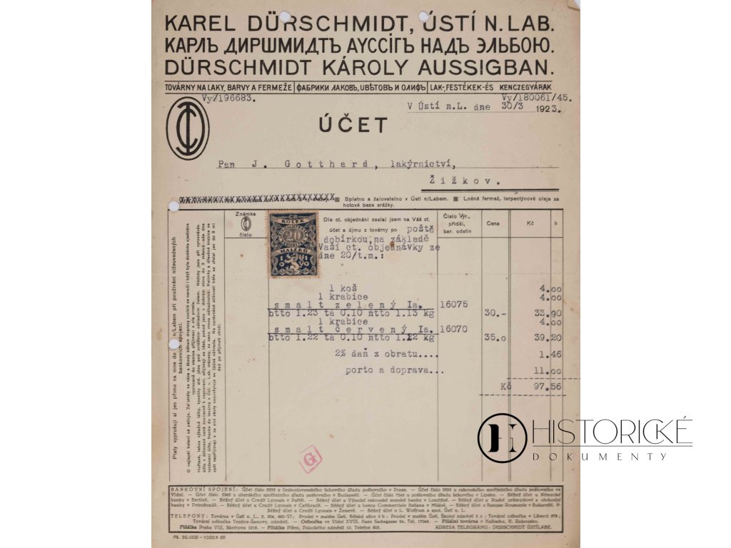 Faktura z továrny na laky, barvy a fermeže Karla Durschmidta v Ústí nad Labem, vystavená dne 30. března léta 1923. Dokument opatřen jest kolkem ve výši dvaceti haléřů. Ústí nad Labem, město průmyslové na severu Čech, proslulo továrnami chemickými, jež barvy a laky pro malíře pokojů, natěrače i řemeslníky rozličné vyráběly. Fermeže, oleje to schnoucí, sloužily k ochraně dřeva i kovu před zkázou časovou. Firma Durschmidtova, jménem německým, náležela k podnikům kraje sudetského, kdež Němci i Češi vedle sebe hospodařili. Vzácný doklad průmyslu chemického a obchodního života v prvních letech republiky Československé