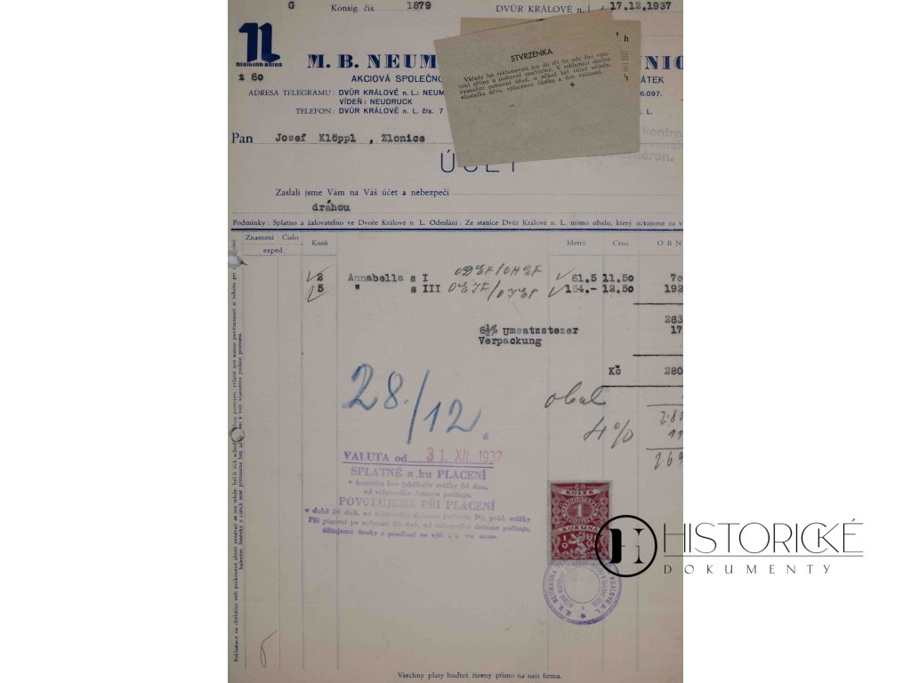 Faktura od slovutné firmy M.B. Neumanna synové Union, akciové společnosti pro průmysl textilní, vystavená dne 31. prosince léta 1937, v poslední den roku toho. Dokument opatřen jest kolkem ve výši jedné koruny a nalepena jest složenka poštovní, jež k úhradě faktury sloužila. Textilní průmysl náležel k pilířům hospodářství českého, továrny přádelnické a tkalcovské zaměstnávaly tisíce dělníků pilných. Jméno Neumann svědčí o účasti židovských podnikatelů v průmyslu českém, než doba temná holocaust přinesla. Akciové společnosti sdružovaly kapitál k podnikům velikým. Vzácný doklad průmyslu textilního poslední doby míru před válkou druhou