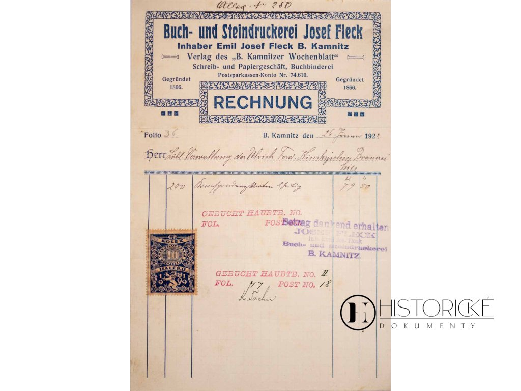 Faktura- Buch - und Steindruckerei, J. Fleck, 1922