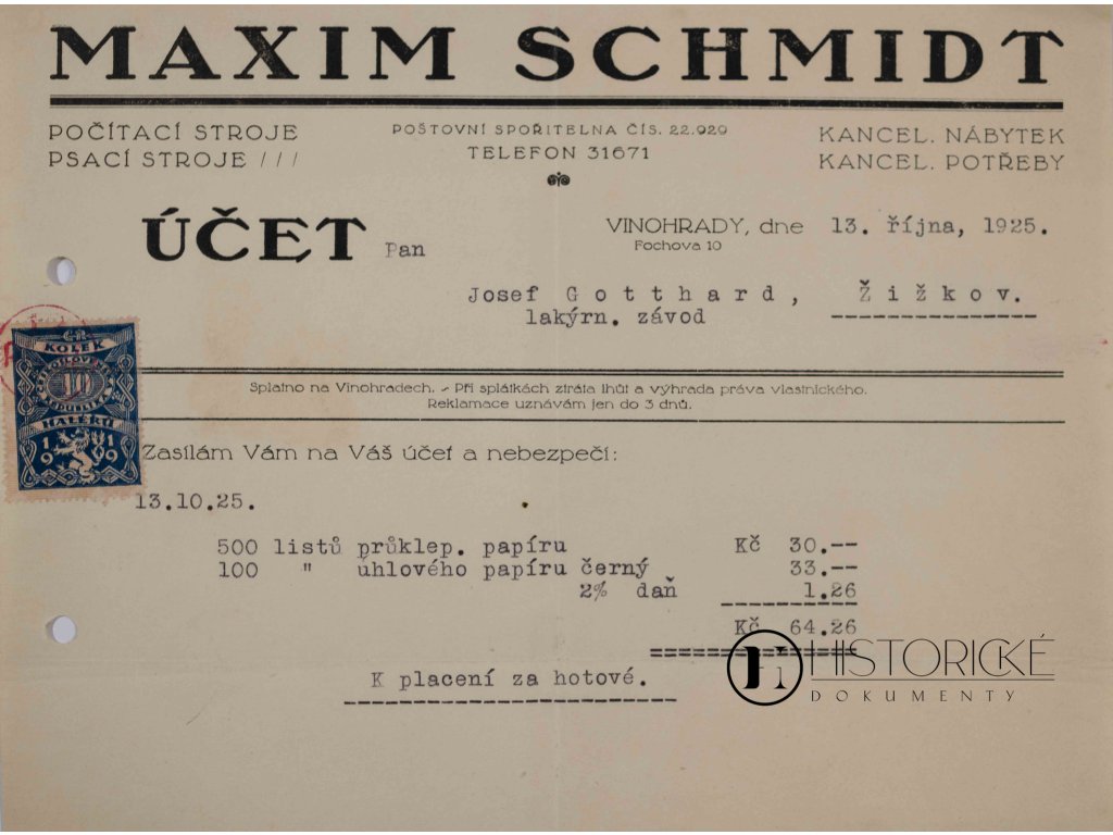 Faktura firmy Maxim Schmidt, obchod s počítacími a psacími stroji, vystavená dne 13. října 1925. Psací a počítací stroje představovaly v meziválečném období vrchol kancelářské techniky, nezbytný pro moderní obchodní korespondenci, účetnictví a úřadování. Firmy specializované na prodej a servis těchto strojů prosperovaly v éře hospodářského rozmachu první republiky. Značky jako Remington, Underwood či Continental zněly jako symboly pokroku a efektivity. Faktura opatřena nalepeným kolkem 10 haléřů dle poplatkových předpisů československých. Dokument zachován na firemním papíře, strojopis čitelný. Vzácný doklad obchodu s kancelářskou technikou a mechanizace úřadů v mladé republice československé