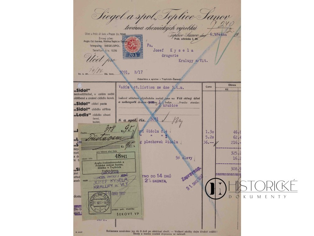Faktura firmy Siegel a spol., továrny chemických výrobků v Teplicích-Šanově, vystavená roku 1937. Teplice-Šanov, lázeňské město v severních Čechách, hostilo vedle lázní i průmysl chemický využívající nerostného bohatství kraje podkrušnohorského. Továrny chemické vyráběly od barev a laků přes mýdla po léčiva a preparáty průmyslové. Faktura opatřena firemním razítkem a vlastnoručním podpisem odpovědné osoby. Dokument nese perforaci, patrně značku zaplacení či archivační, a jest přeškrtnut dle účetní praxe dobové. Tištěný kolek 20 haléřů dokládá splnění povinnosti poplatkové. Firma Siegel reprezentuje německy hovořící podnikatelstvo sudetské, jehož osudy změnil rok následující tragicky. Papír firemní, zachovalost dobrá