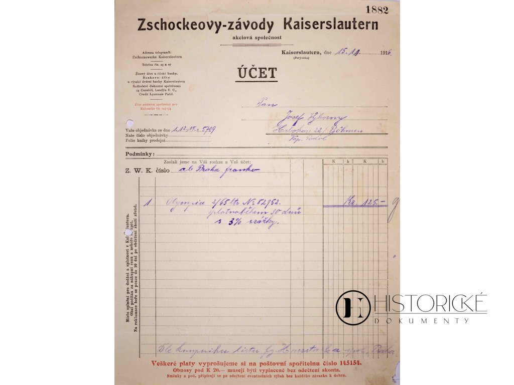Faktura - účet Zchockeovy závody Kaiserlslautern, 1916