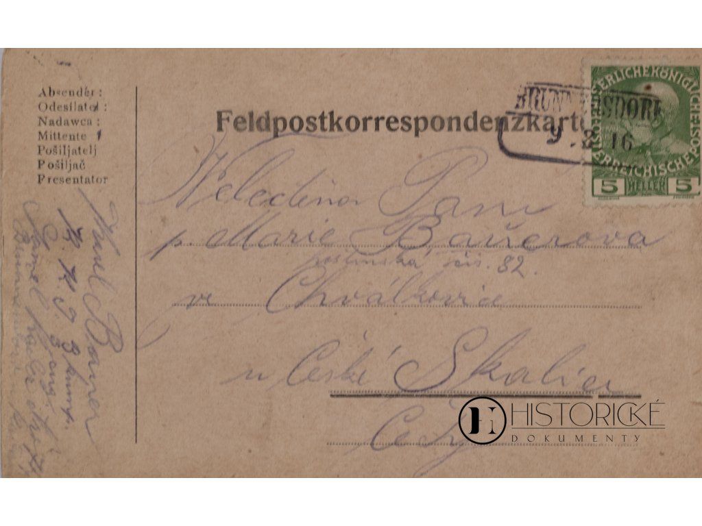 Zásilka jest vlastnoručně psána česky a adresována slovutné paní Marii Bauerové, popisné číslo 82, v Chvalkovicích u České Skalice v Čechách. Na rubu jest dojemný vzkaz vojáka matce — Milá maminko — plný srdečných pozdravů a útržků válečného každodenního života. Polní korespondence z let 1914–1918 jest dnes sběratelsky i lidsky dokumentem hluboce vzácným a dojímavým.