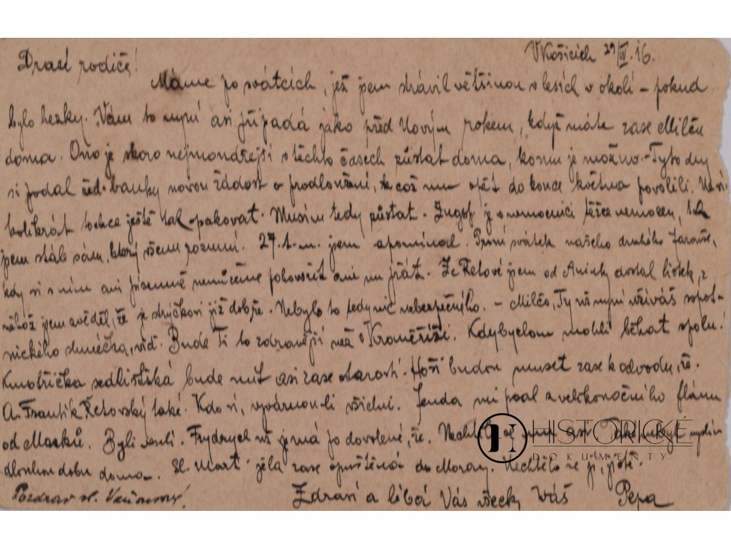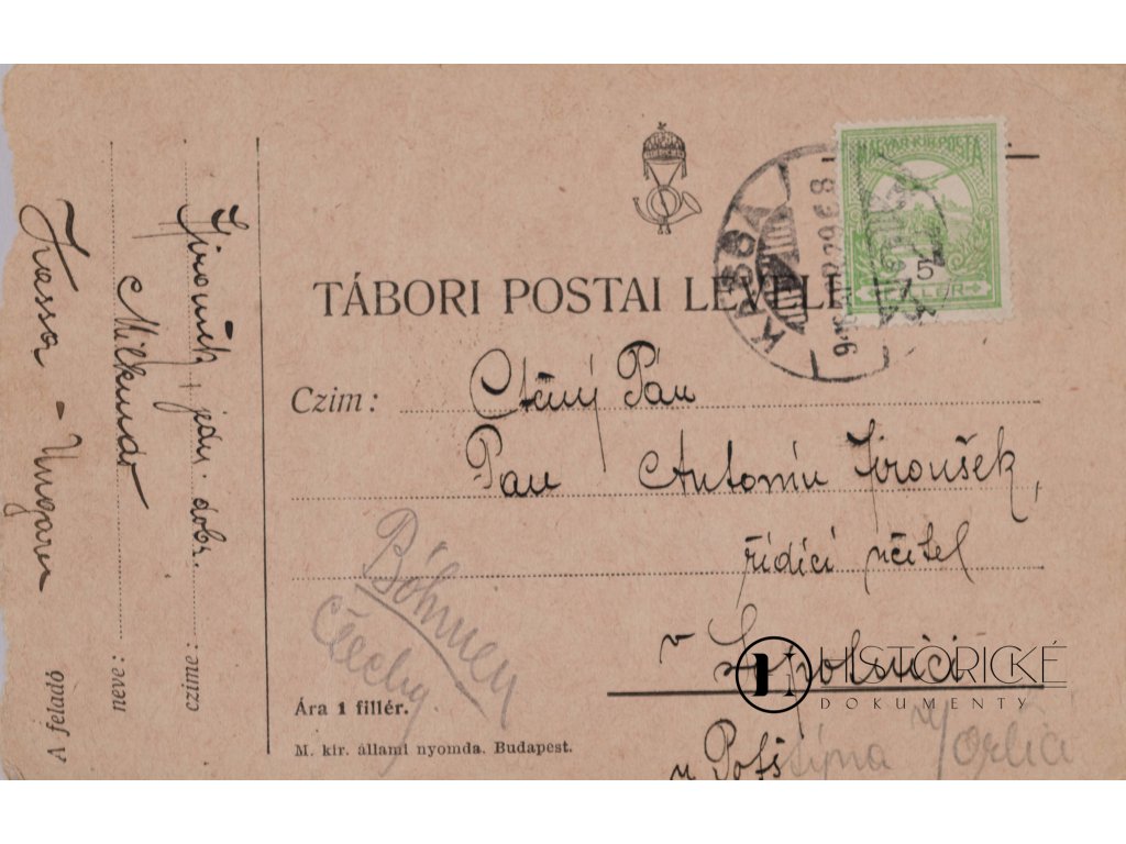Lístek opatřen jest známkou pěti fillérů pošty uherské a razítkem polním. Adresován jest Ctenému Panu Antonínu Hrouškovi, řídícímu učiteli ve Spoluci u Postoloprt v Čechách, s přípiskem Böhmen. Odesílatelem jest voják jménem Miklenda z Uher. Tato polní pošta podává dojemné svědectví o válečné korespondenci mezi frontou a domovem v dobách nejstrašnějších. Vzácná památka pro sběratele militarií i filatelisty.