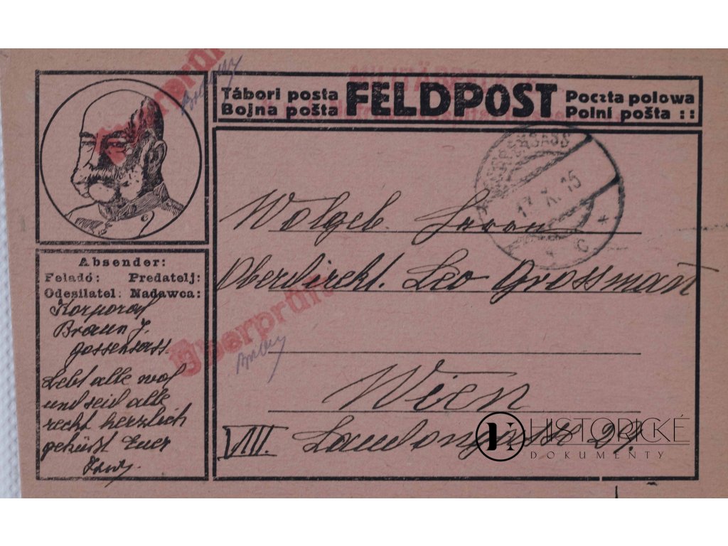 Formulář vícejazyčný s nadpisy Tábori posta, Bojna pošta, Poczta polowa a Polní pošta dokládá mnohonárodnostní ráz armády rakousko-uherské. Odesláno kaprálnem Braunem J. z polní nemocnice. Adresováno panu vrchnímu řediteli Leo Grossmannovi do Vídně VII., Lerchenfelderstrasse 29. Text psán německy kurentním písmem, obsahuje zprávy osobní a pozdravy rodině. Razítko polní pošty a cenzurní značka Überprüft dokládají válečnou kontrolu korespondence. Lístek zachován ve stavu dobrém, papír růžový typický pro Feldpost. Vzácná celistvost z fronty Velké války.