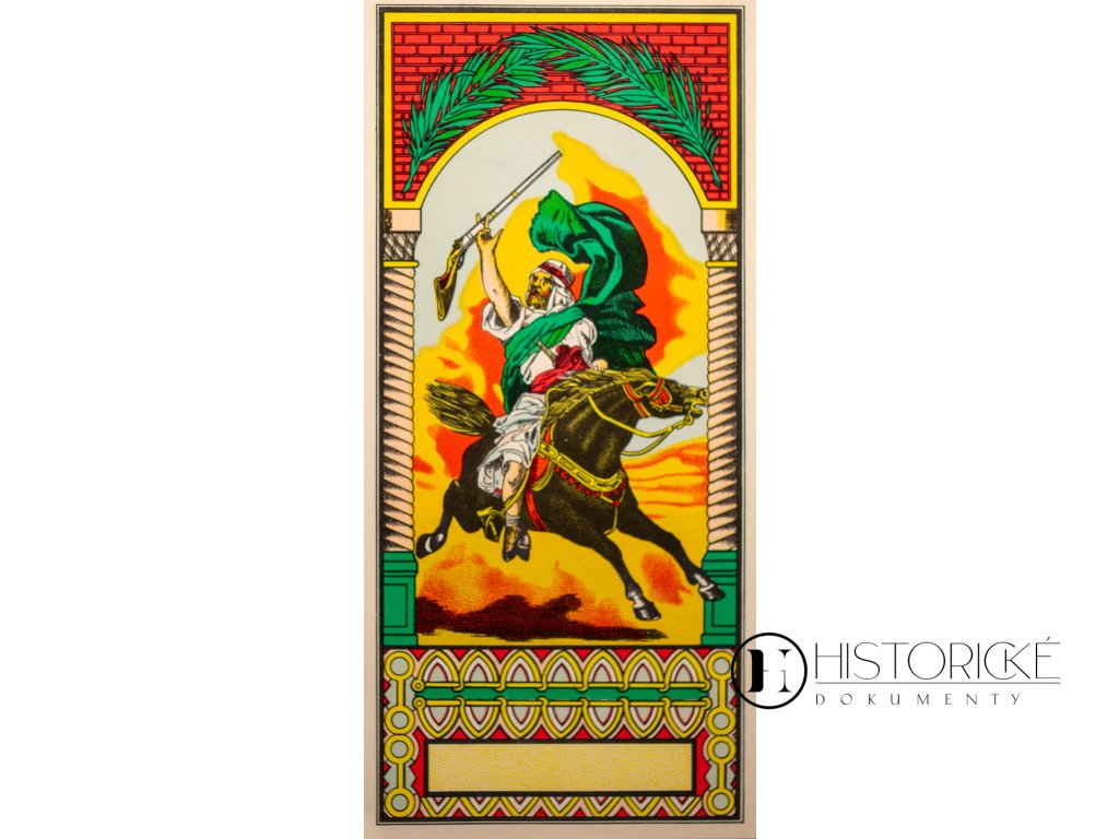 Reklamní materiál Národního podniku Strakonice. Jest to tisk barevný s vyobrazením aranského nájezdníka. Artefakt tento dokumentuje vývoz fezů a látek vlněných ze Strakonic do zemí orientálních a jest dokladem velezdařilým průmyslu československého v dobách první republiky.