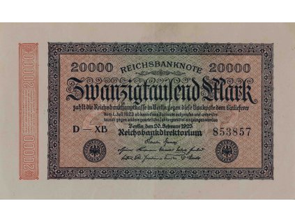 Bankovka 20 000 Mark, D-XB, číslo: 853857 , 1923. Reichsbanknote. Platnost: 02/2023 - 5. 7. 1925. Období: Wiemarer Republik - Deutsche Reichsbank 1918- 1933
