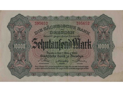 Bankovka 10 000 Mark, Dresden, 1923, číslo: 395652. Platnost: 09/1922 - 08/1923. Období: Deutsches Lander, Privatbanknoten Sachsen, SAX- 13/ str. 427