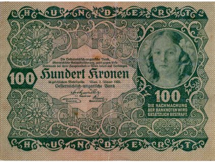 Bankovka Hundert Kronen, (100 korun) 1922, Osteraich Ungarian Bank, 1922. 1023 No: 093561. Osterreichisch - ungarische Bank - Inflationskronen. Platnost: 5. 7. 1922 -31....