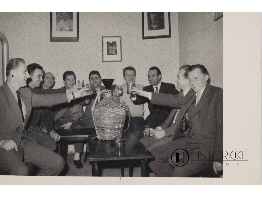 Fotografie zachycující půvabnou scénu ze setkání starých pánů — slavných fotbalistů — u demižonu vína, na níž jest zvěčněn proslulý Jan Lála, jedna z ikon českého fotbalu. Snímek dýchá neopakovatelnou atmosférou přátelství, vzpomínek a neztenčené životní radosti mužů, kteří svého času okouzlovali tisíce příznivců kopané na stadionech celé vlasti. Takovéto neformální fotografie slavných sportovců jsou dnes pro sběratele sportovní historie a fotografie cennější než mnohý oficielní portrét, neboť zachycují hrdiny takové, jací skutečně byli.