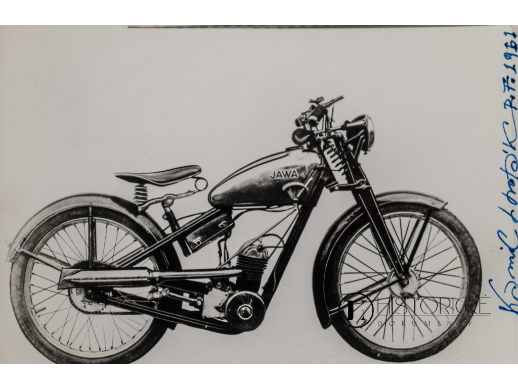 Kopie vzácného novoročního přání PF 1961 s fotografií motocyklu Jawa od slavného malíře a ilustrátora Kamila Lhotáka. Mistr, jenž proslul zobrazováním strojů létajících i pozemních, věnoval svou lásku též motocyklům československým. Jawa, chlouba průmyslu domácího, vyvážena bývala do zemí všech světadílův. Lhoták, člen skupiny 42, zachytil stroj v poetice sobě vlastní, kde technika s nostalgií se snoubí. Fotografické PF dokládá umělcovu zálibu v motorismu i jeho přátelství s továrnou jawou. Skvostná památka z dob, kdy československý design světovou proslulost požíval.