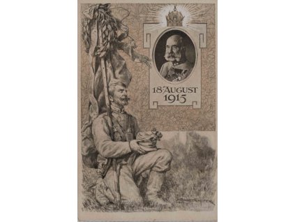 Pohlednice, Kaiser Franz Josef I, 18. August, 1915. Nadepsaná, prošlá, známka. Bruder Kohn, Wien.