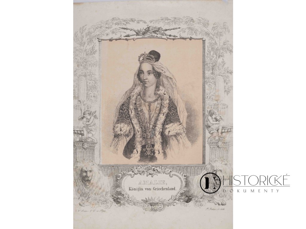 Grafika historická, ocelorytina jemná z knihy staré, zobrazující Její Veličenstvo Amálii, královnu řeckou, německy Königin von Griechenland. Amálie Oldenburská, princezna z rodu severoněmeckého, stala se chotí krále Oty I., prvního krále Řecka moderního, jehož velmoci evropské na trůn helénský dosadily. Královna Amálie proslula krásou svou i péčí o zahrady athénské, jež dodnes jméno její nesou. Rytina provedena jest technikou oceloryteckou, čárky jemné modelují tvář ušlechtilou, účes složitý i šaty nádherné doby romantismu. Doba tato milovala portréty královen a princezen evropských. Vzácný list pro sběratele grafiky a ctitele monarchií balkánských.